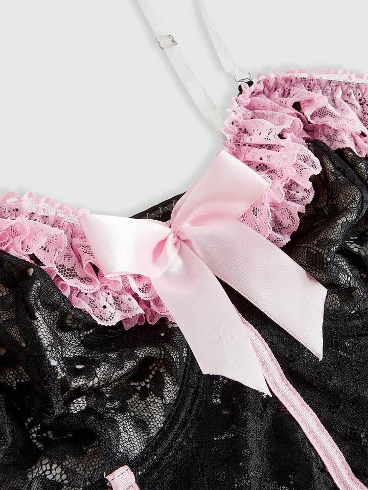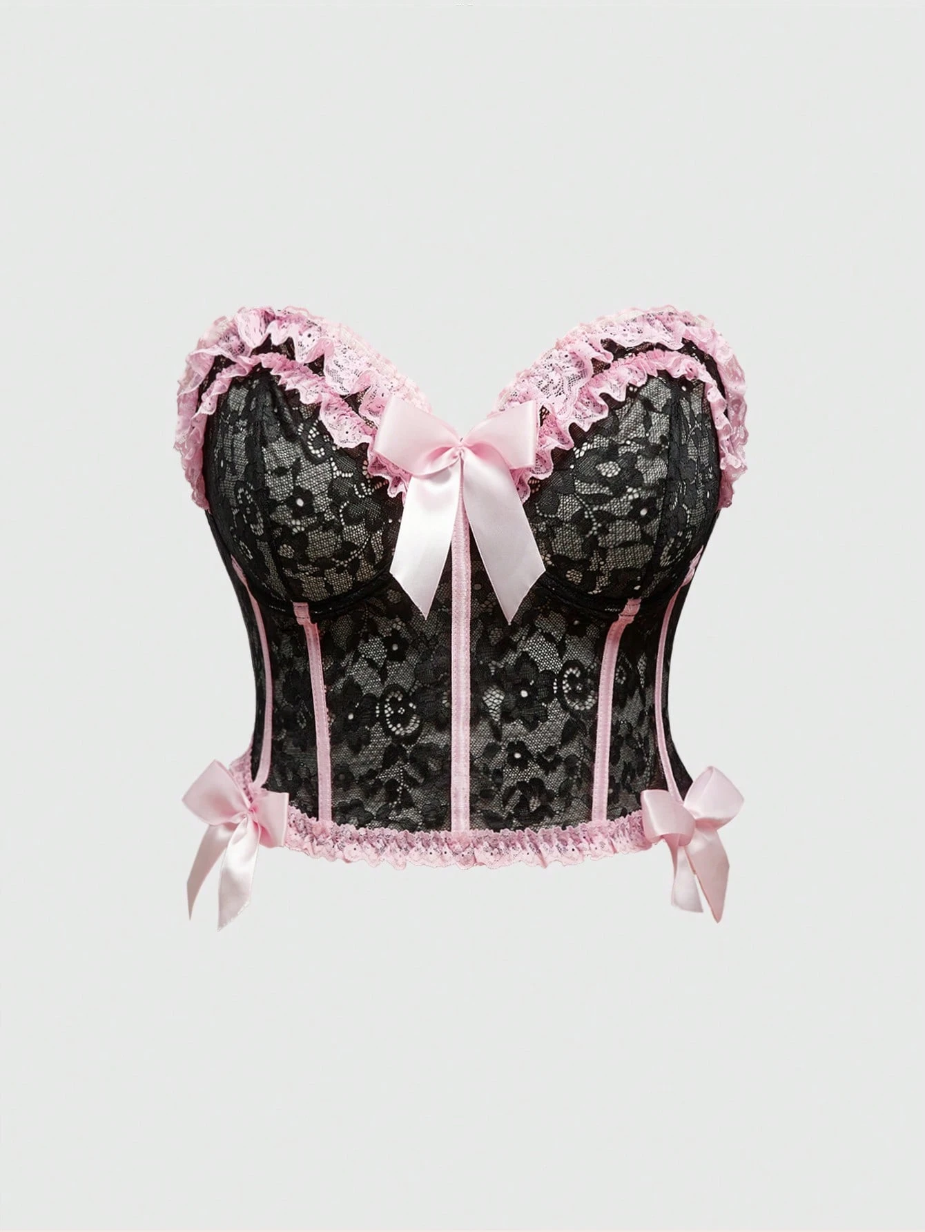 Kawaii Maglietta oversize da donna con bordi in pizzo, cucitura a spina di pesce, spalline, decorazione con fiocco, senza maniche