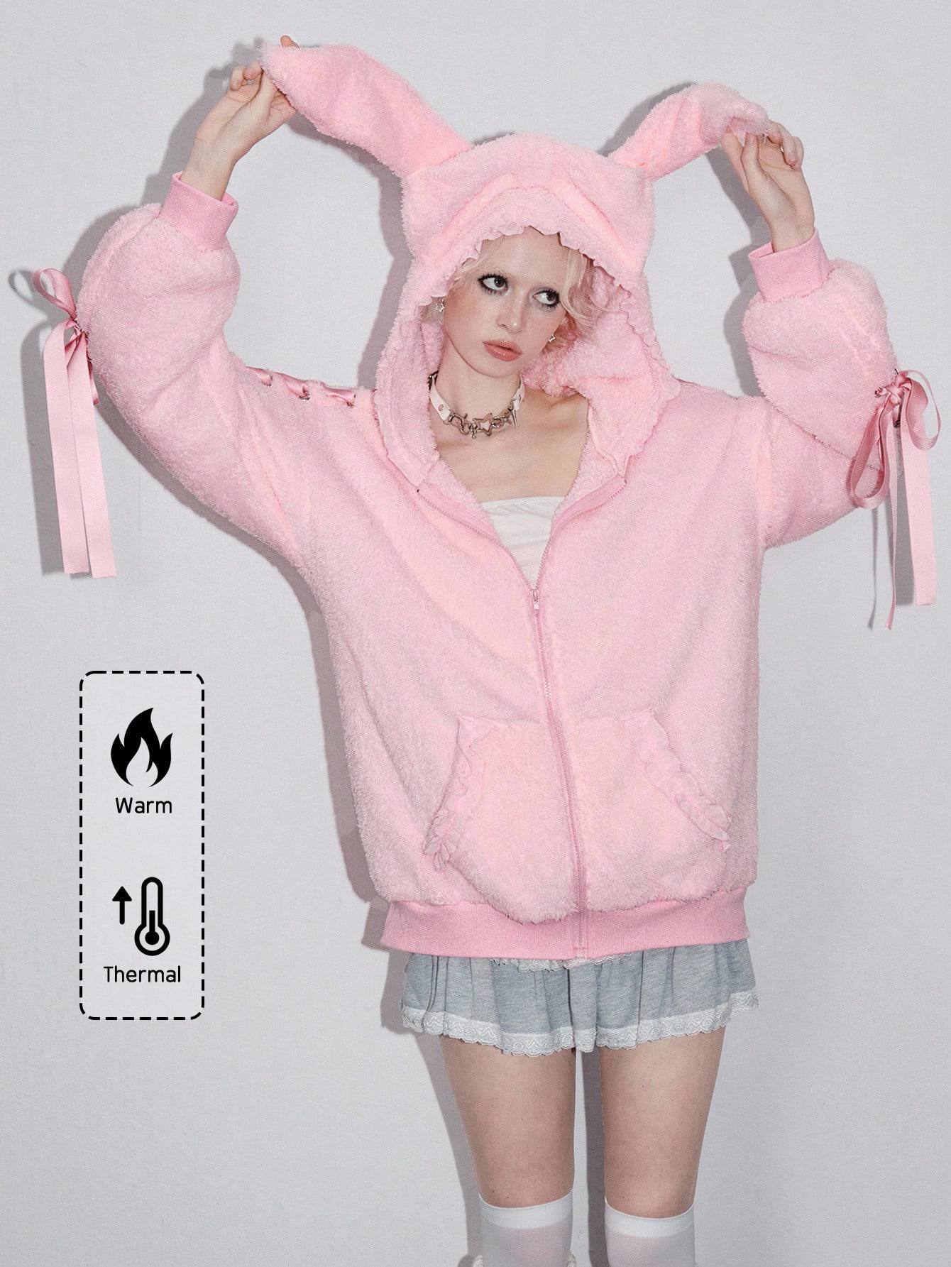 Kawaii Felpa da donna con decorazione in pizzo e fiocco a forma di orecchie di coniglio
