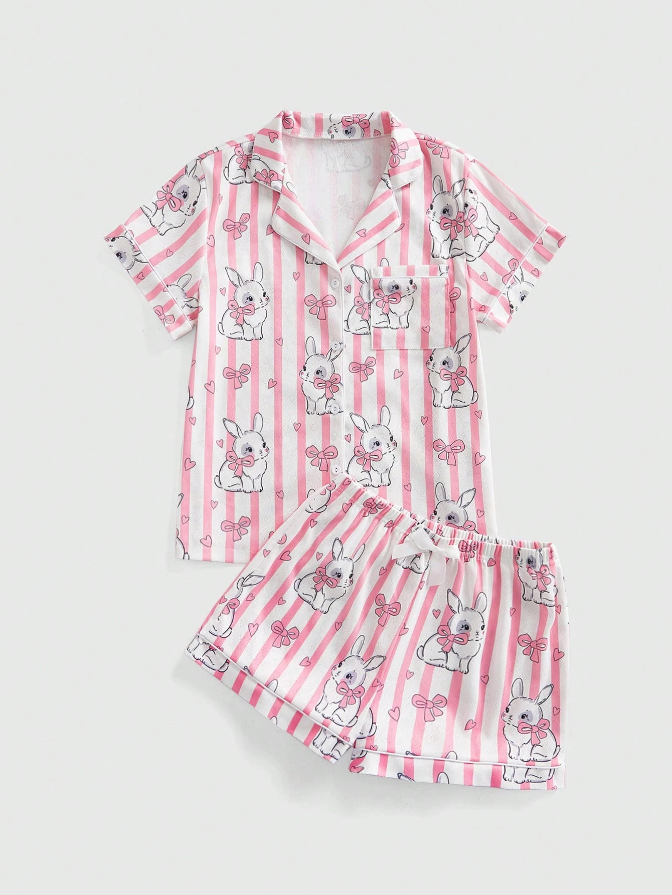 Kawaii Set di pigiama con maglietta e pantaloncini a stampa di coniglio, righe e cuori, motivo cartoni animati