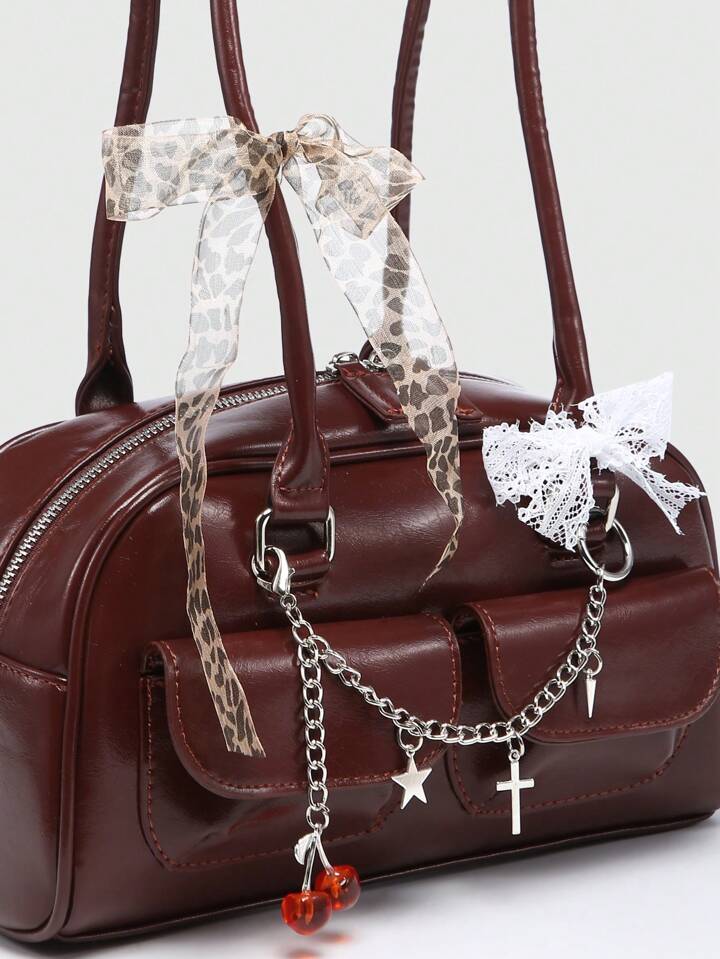 Kawaii Borsa a tracolla/ascellare da donna in stile retrò e carino, con cinturini a quadri e fiocchi, decorazioni a cuore e ciliegie, con tasche multiple, tipo Boston