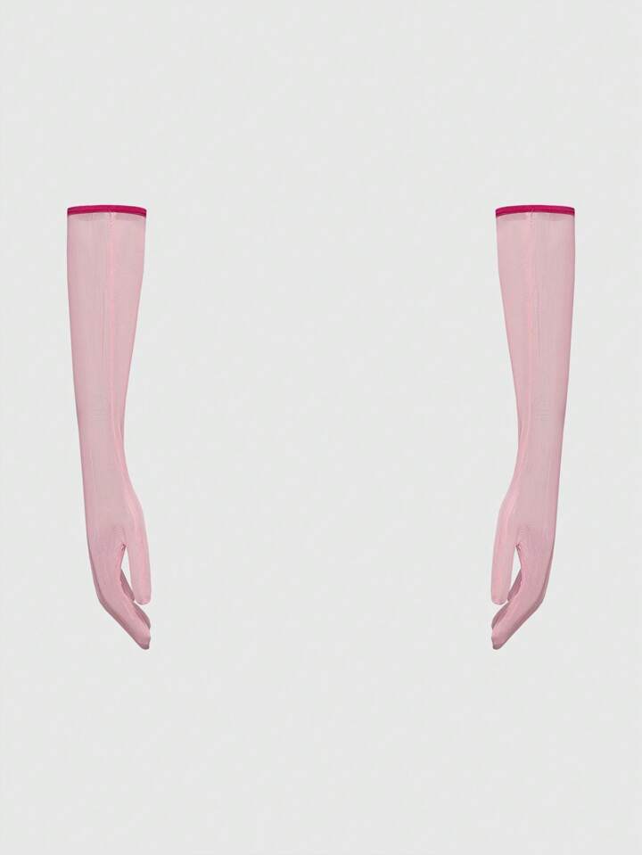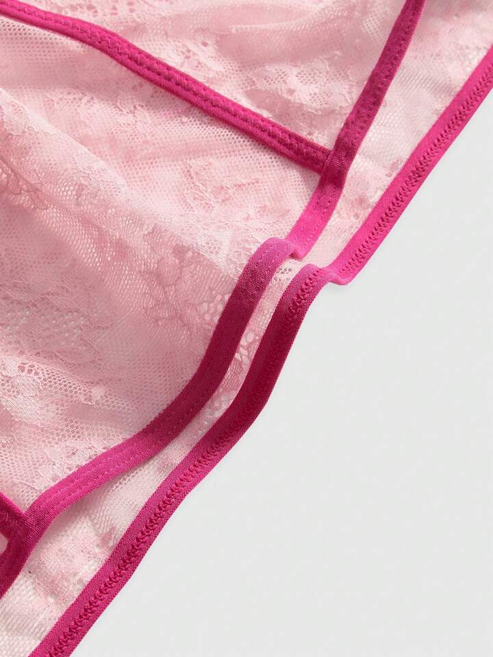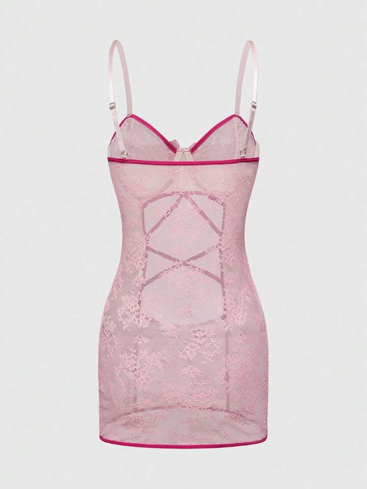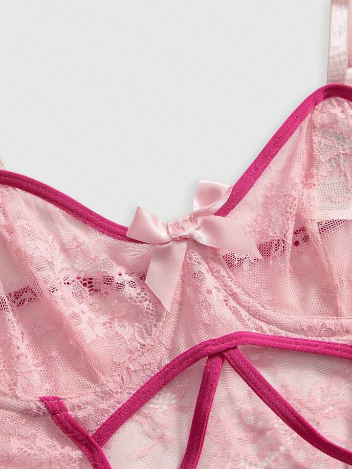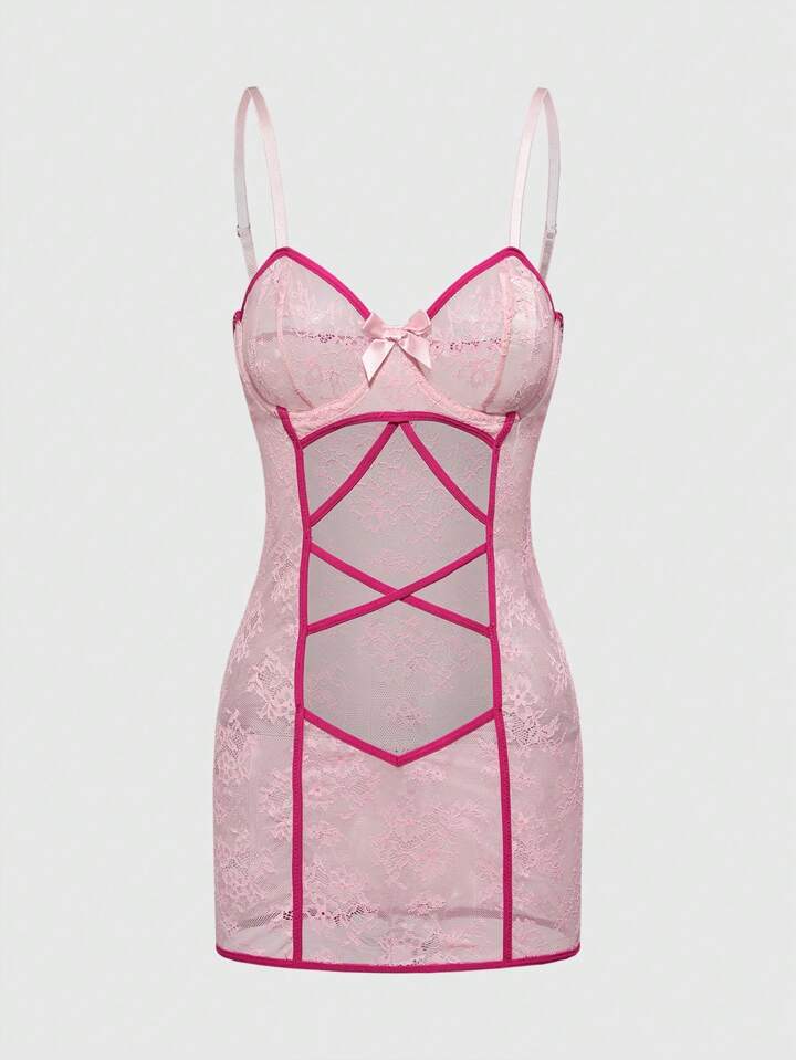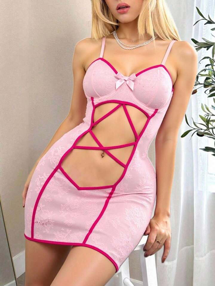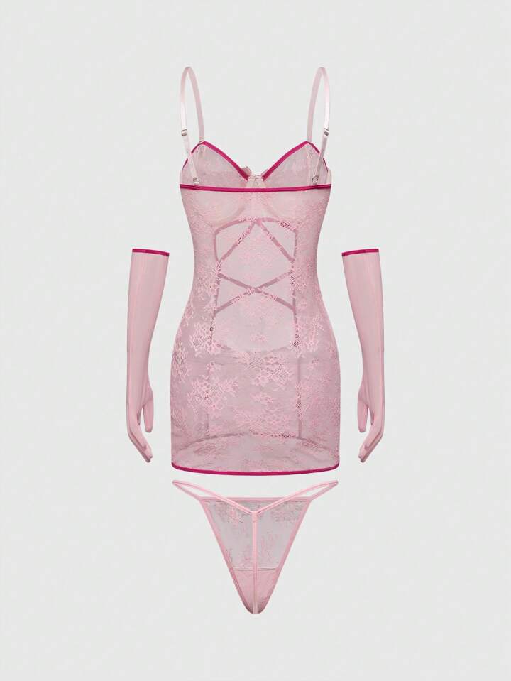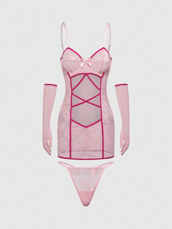 Kawaii Set di lingerie con abito con volant, incrocio sulla schiena e scollatura, effetto traforato, con guanti (per donna)