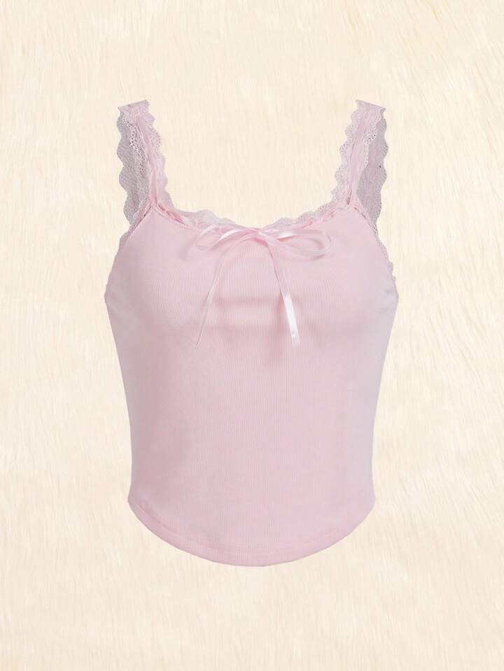 Kawaii Top con bretelle sottile monocolore pizzo a contrasto