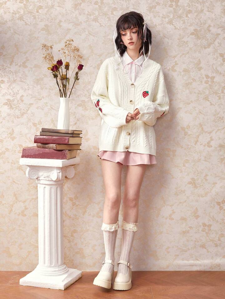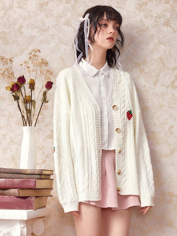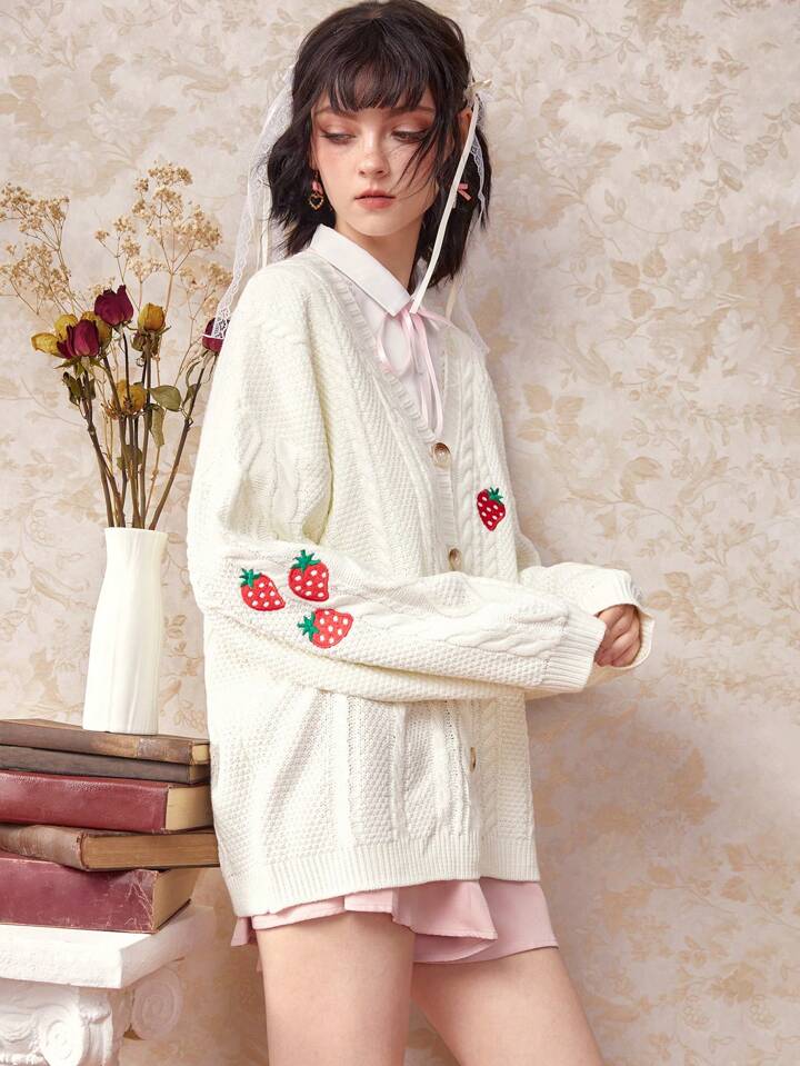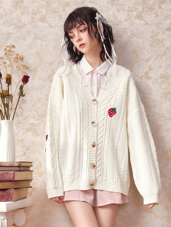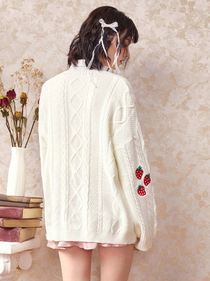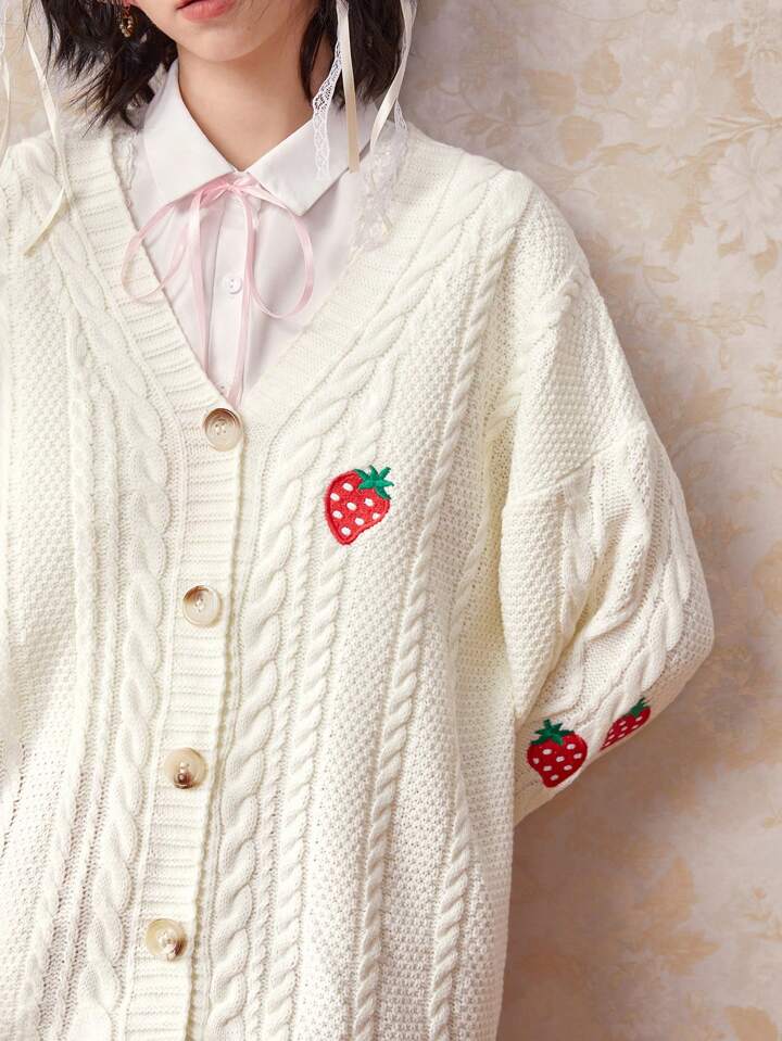 Kawaii Cardigan con ricamo fragola in maglia a trecce spalle cadenti