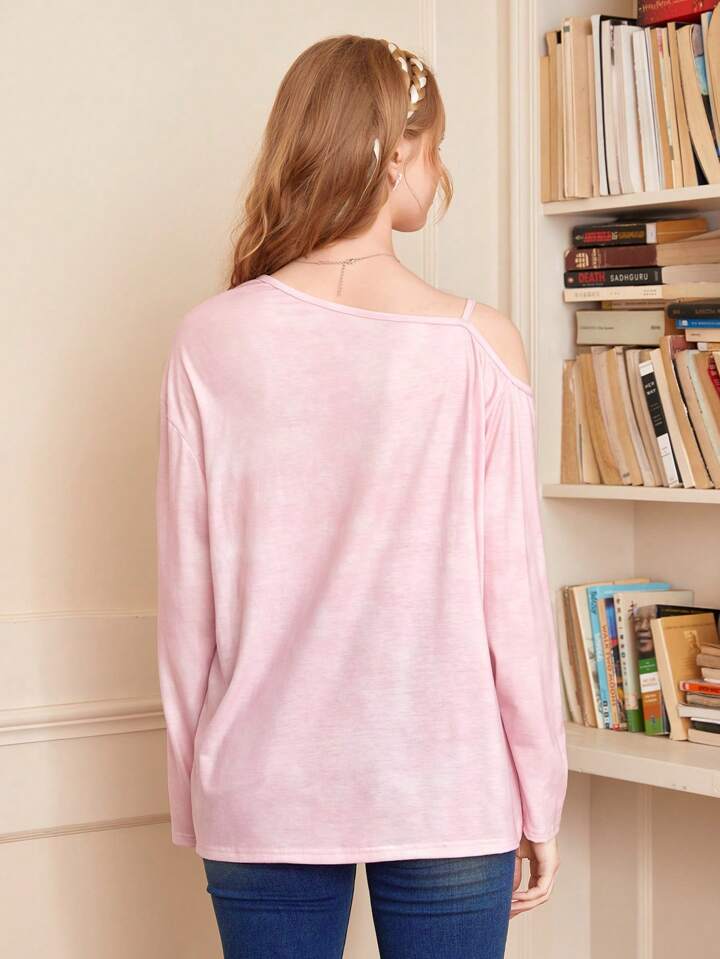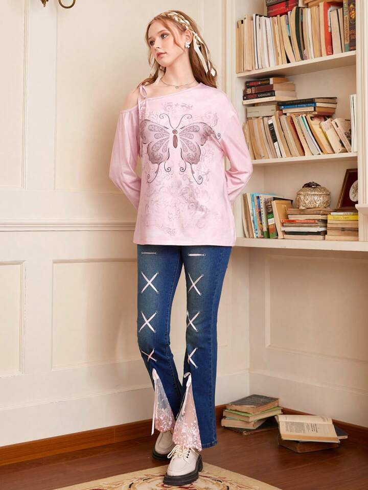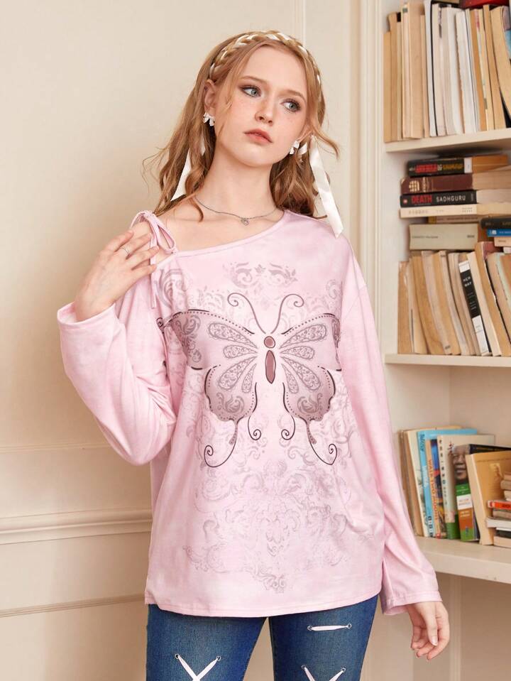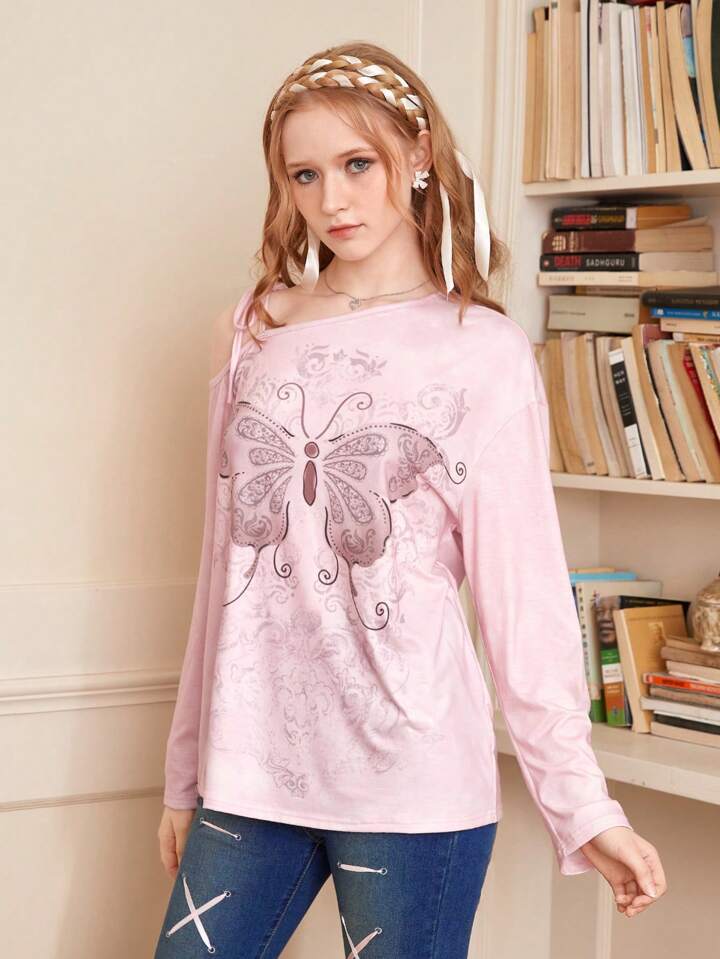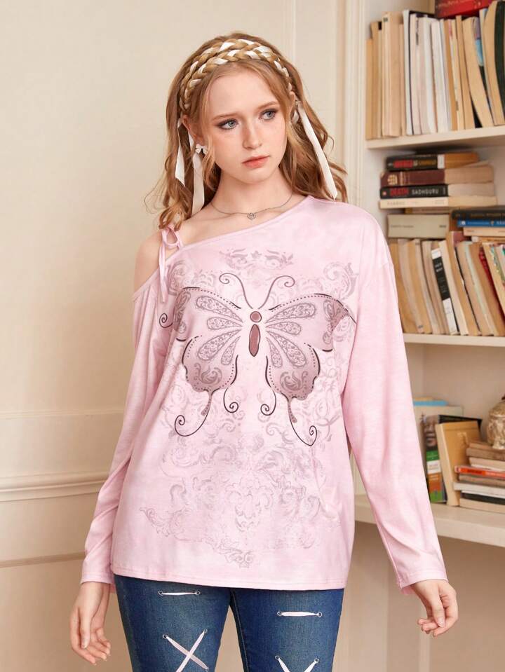 Kawaii Maglietta tie dye con stampa farfalla scollatura asimmetrica