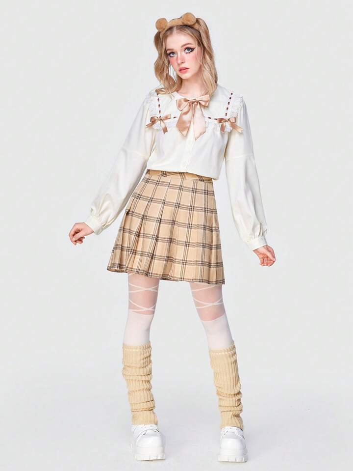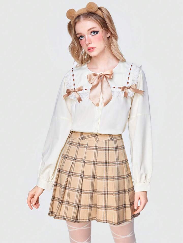 Kawaii Camicetta con cravatta al collo fiocco frontale merletto manica a lanterna