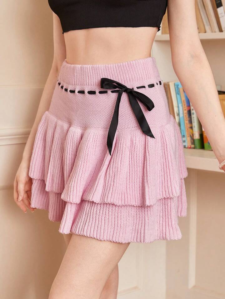 Kawaii Gonna in maglia fiocco in vita a 2 strati orlo