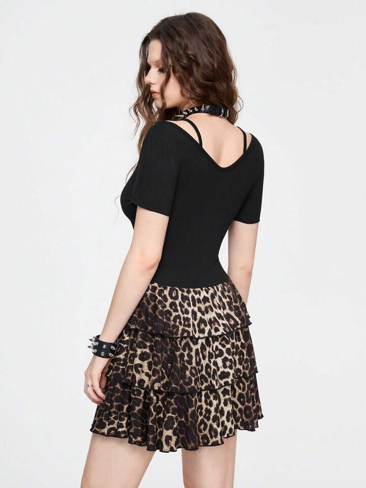 Kawaii Abito da donna con scollo a V, stampa leopardata e orlo a strati