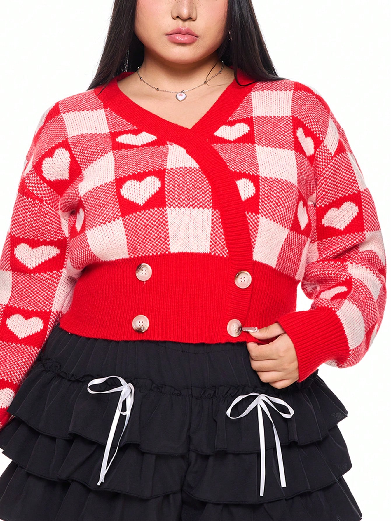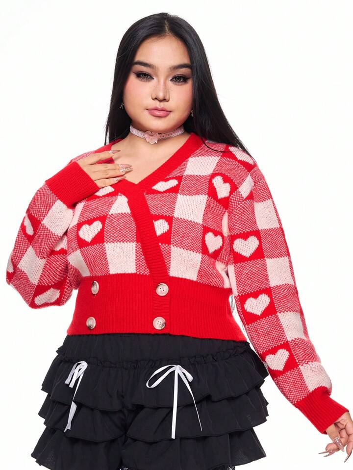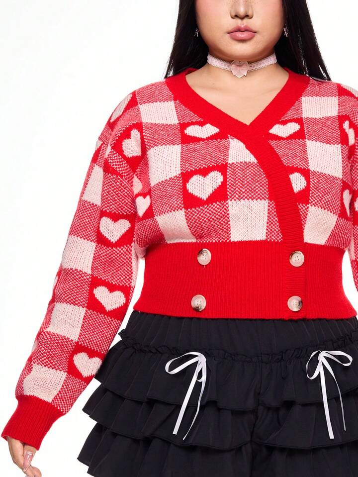 Kawaii Maglione a scollo a V con motivo a cuori e quadretti per San Valentino