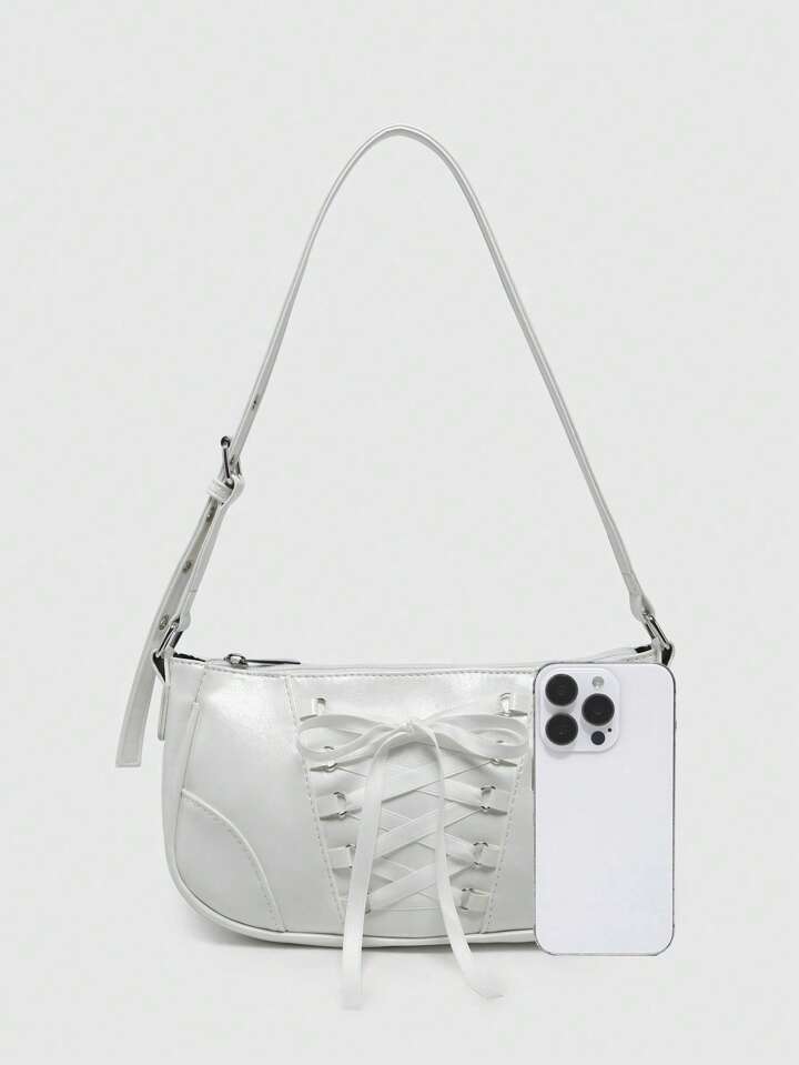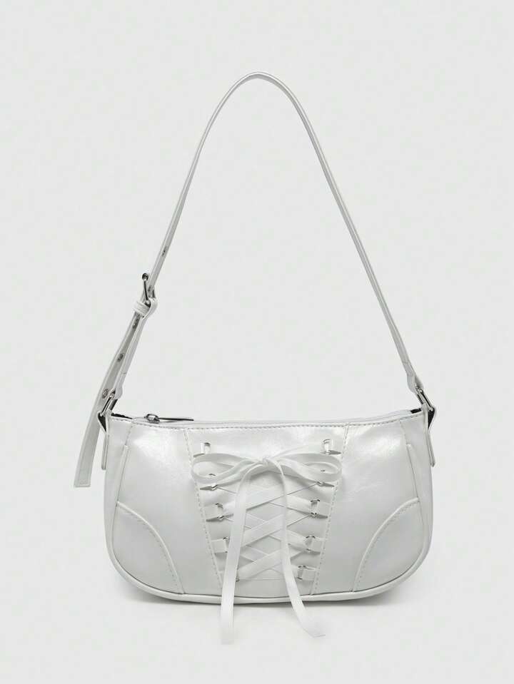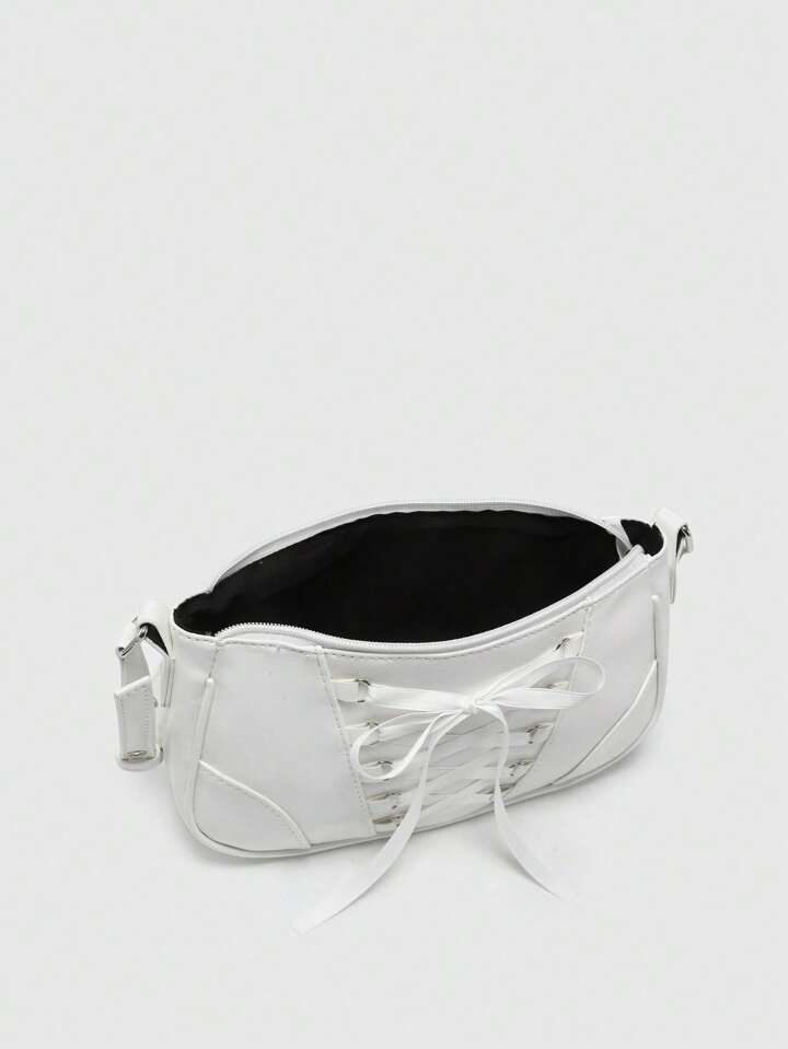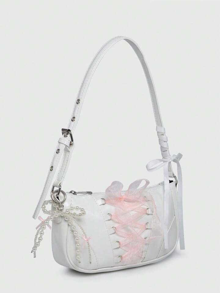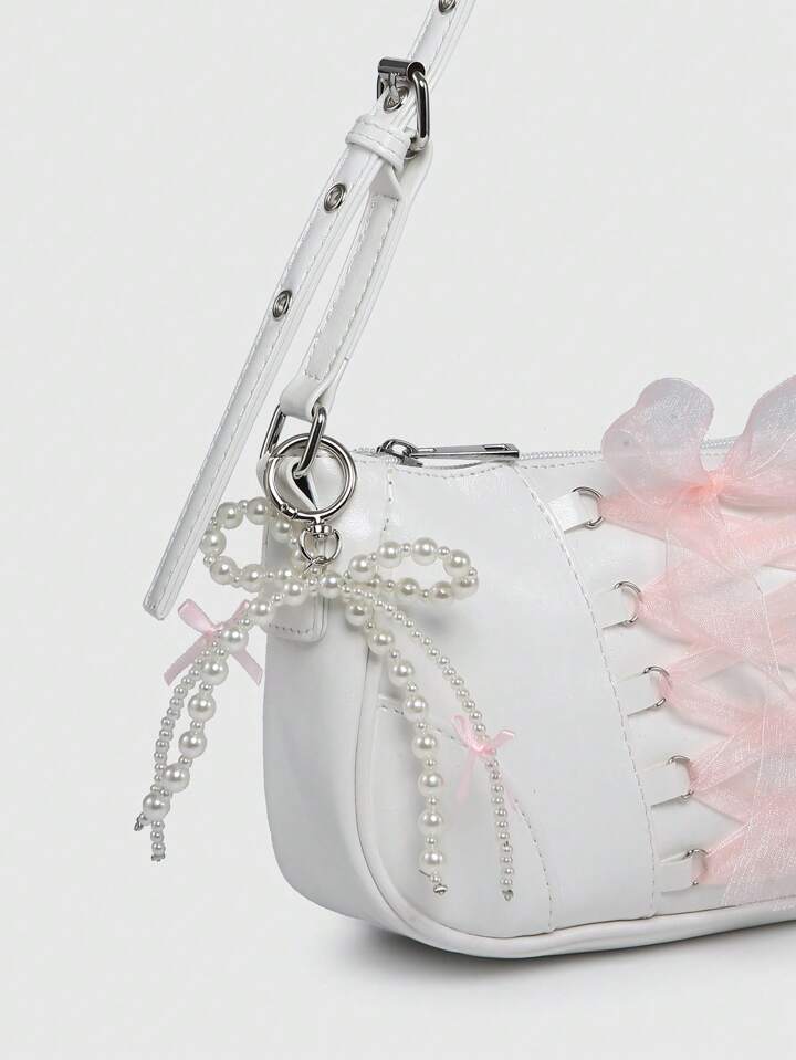 Kawaii Borsa a baguette da donna con decorazione vintage stile balletto con fiocco, catena e pizzo con perle, a tracolla incrociata sottopelle
