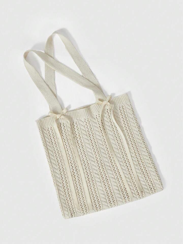 Kawaii Borsa a tracolla stile vintage in maglia con fiocco, grande capacità, borsa da spiaggia e da viaggio per donna