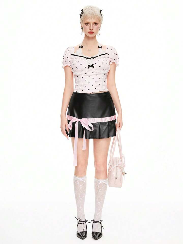 Kawaii Gonna linea A plissettata con fiocco in nastro di tessuto PU, per la scuola