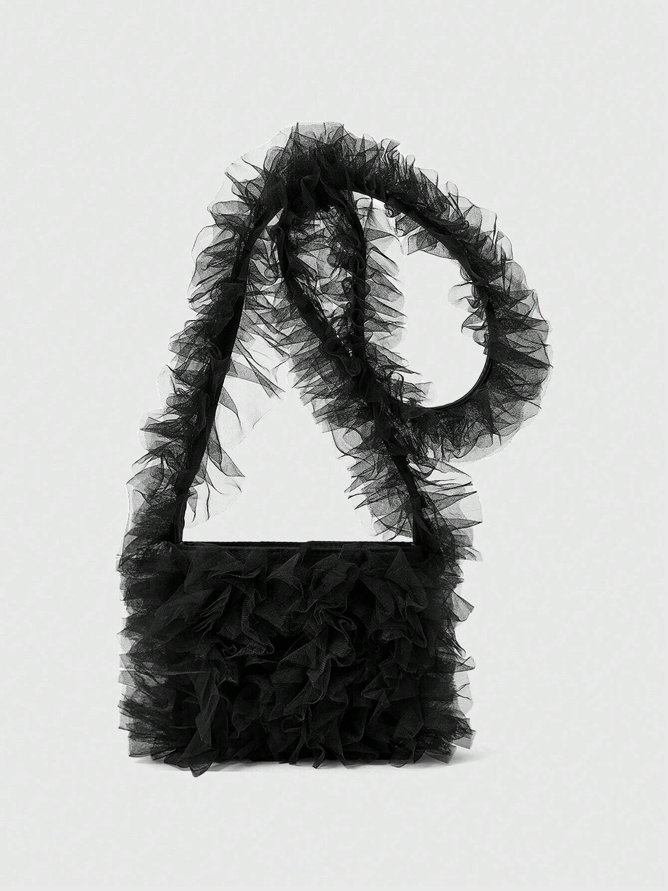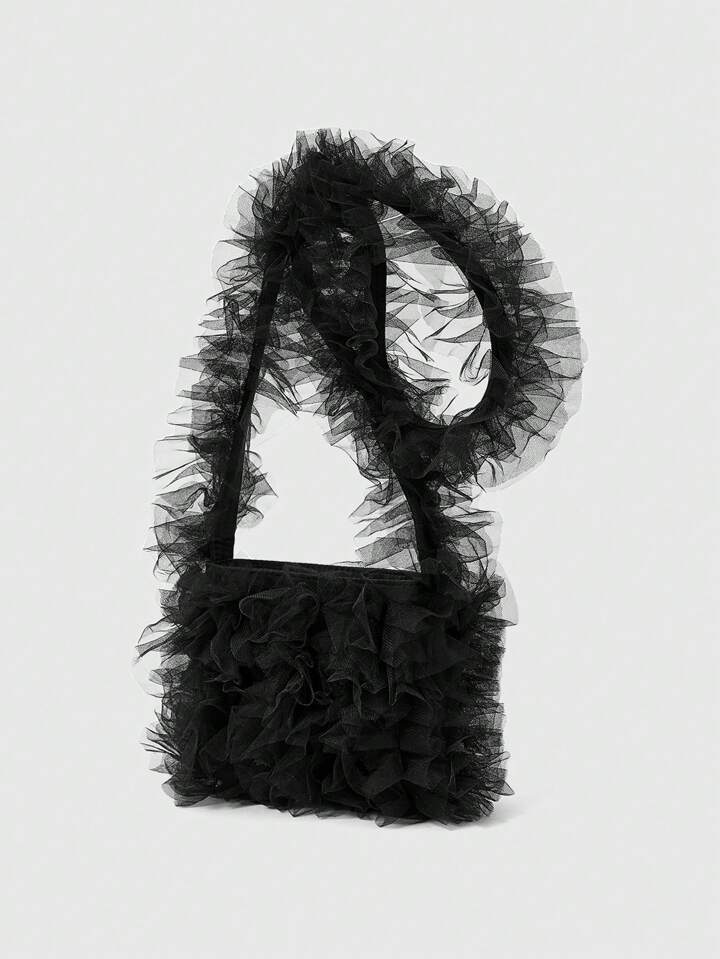 Kawaii Borsa da donna in colore unito con dettagli a volant in rete a contrasto sulla spalla