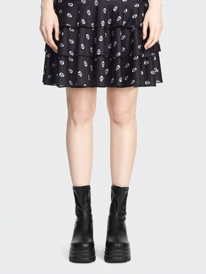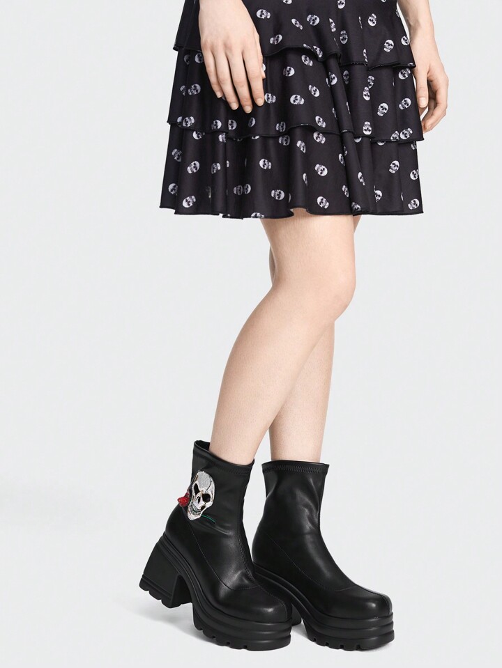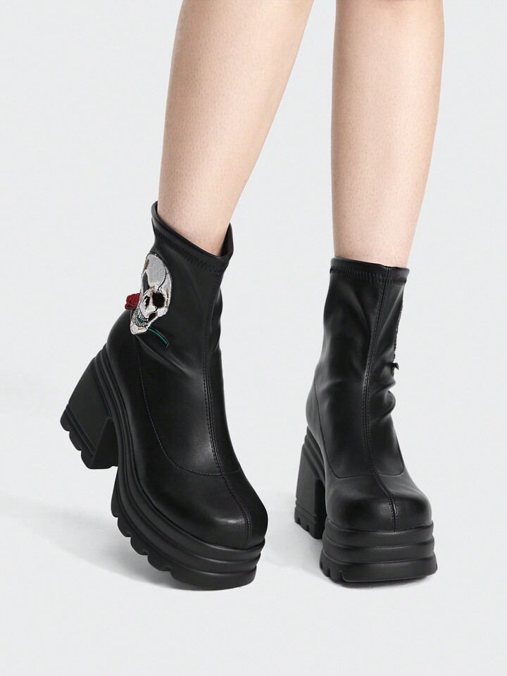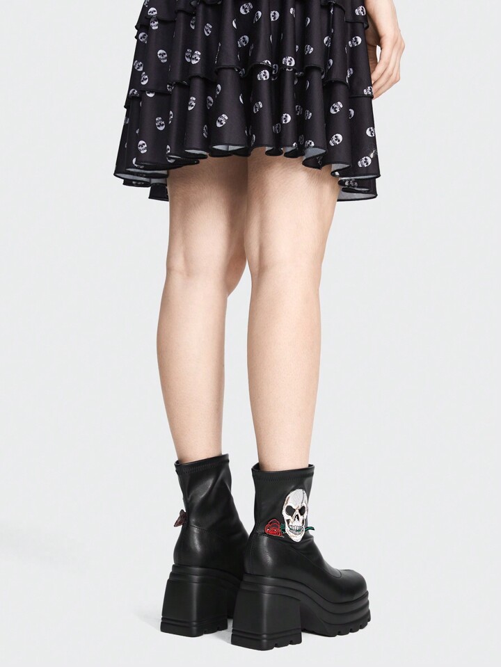 Kawaii Stivaletti alla caviglia stretch casual comodi con testa di teschio per donne, dal taglio stretto