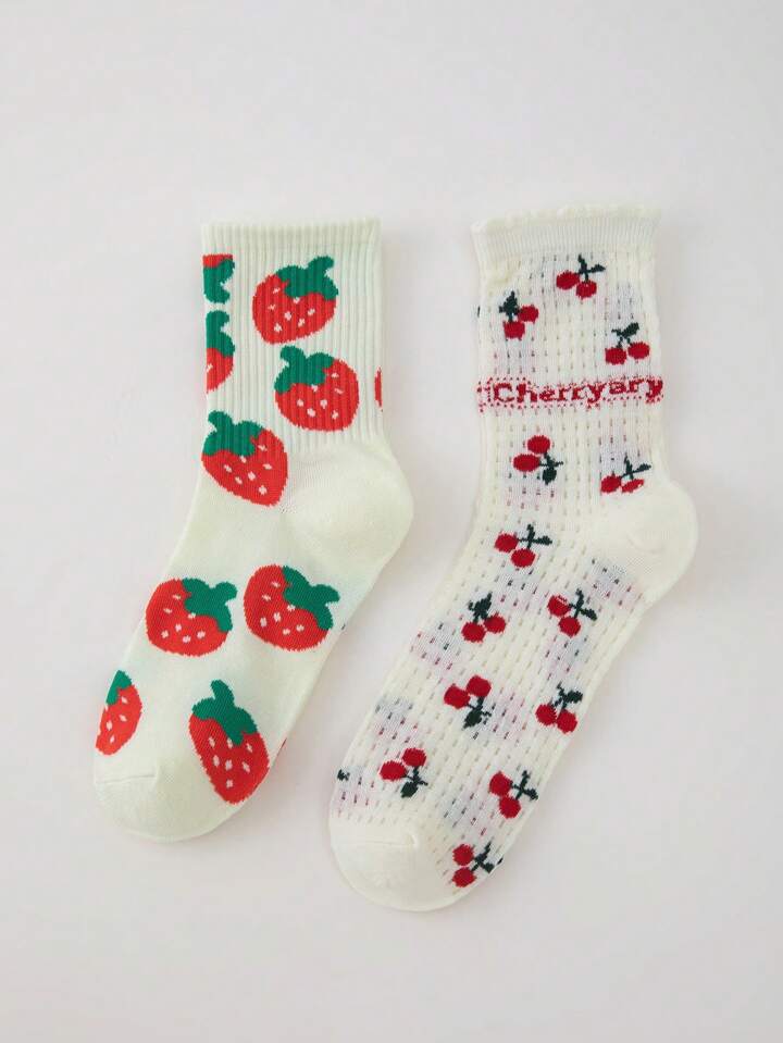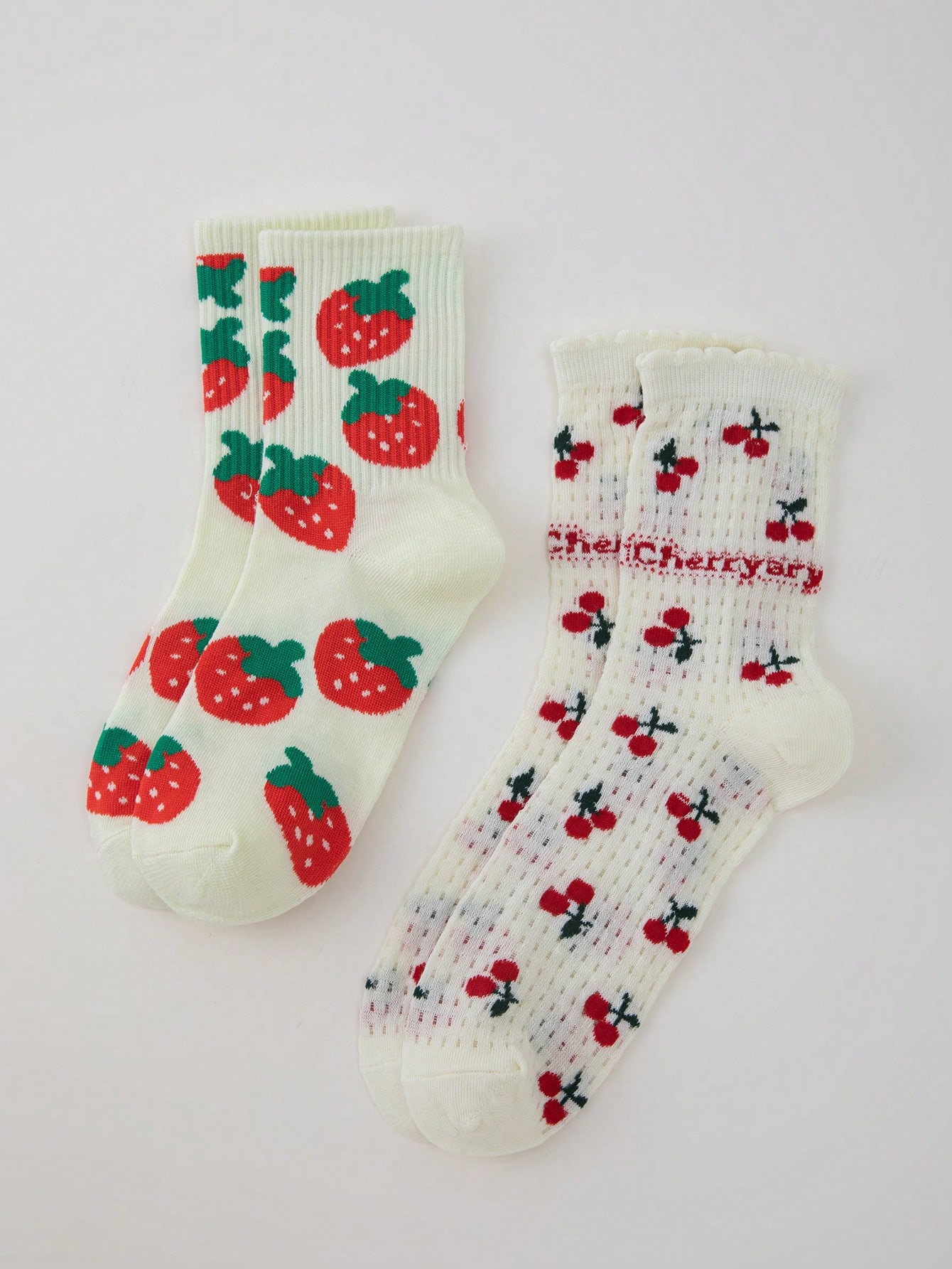Kawaii Calze alla caviglia versatili casual da donna, con intarsio a motivi di fragole e ciliegie