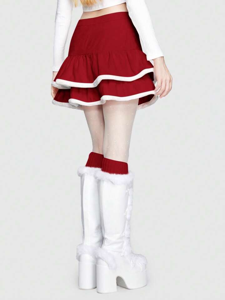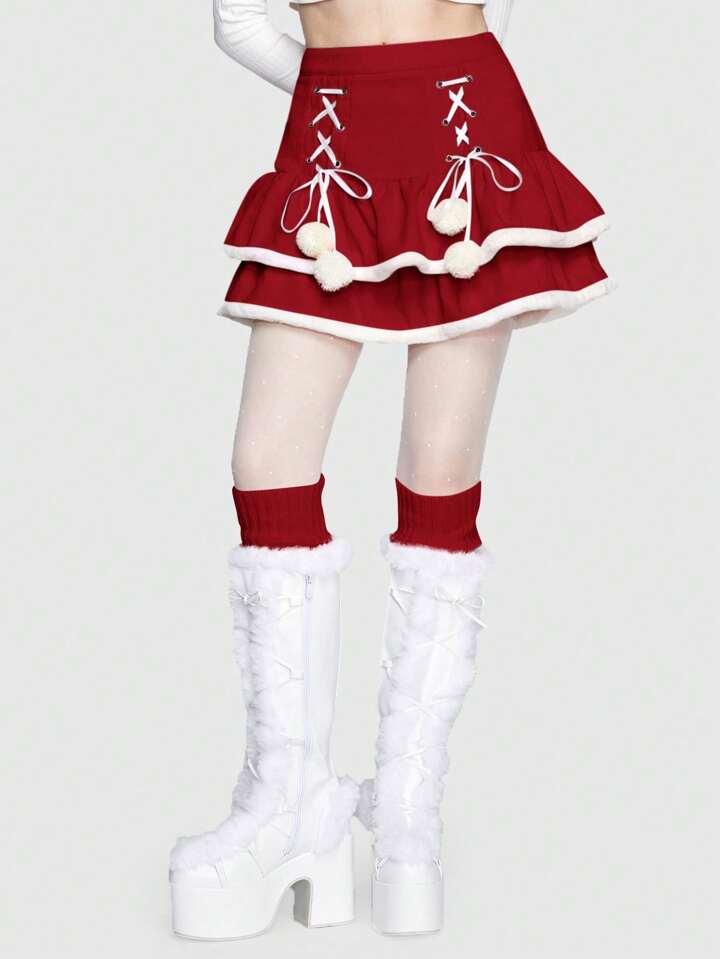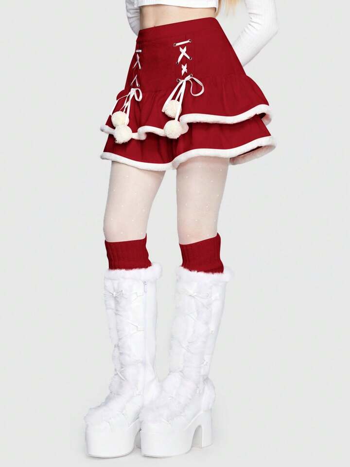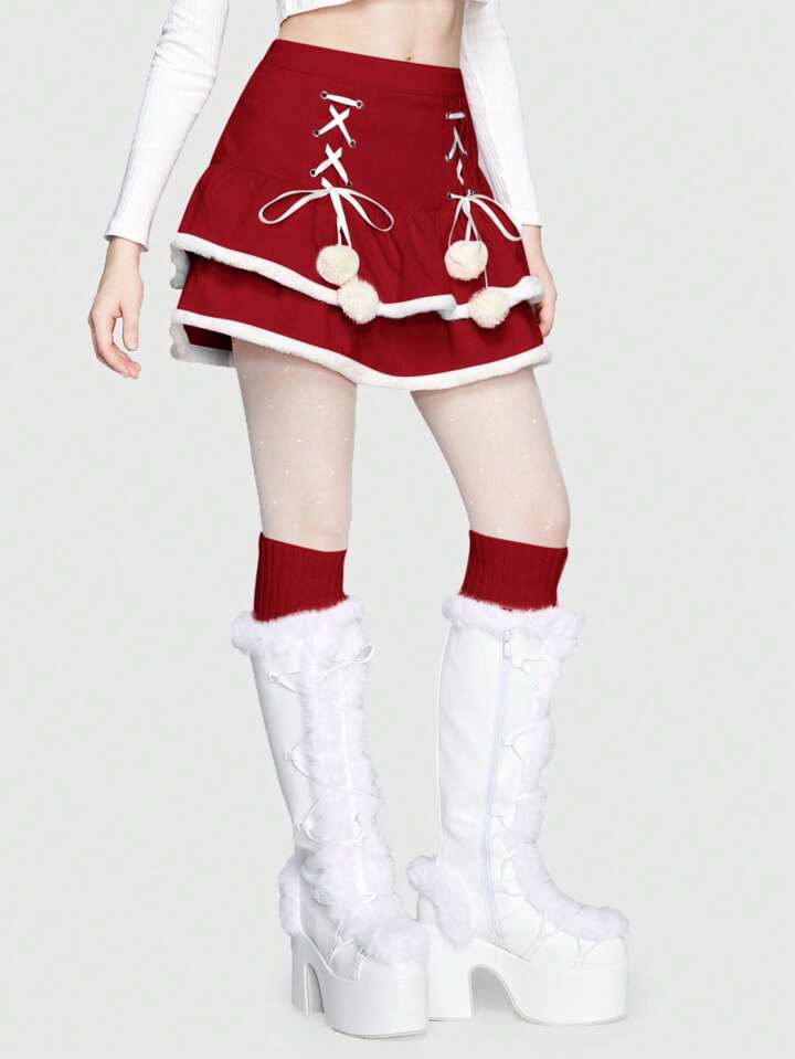 Kawaii Gonna Con Blocchi Di Colore Da Donna Con Orlo Sfilacciato, Cinghia A Croce E Dettagli Pom Pom