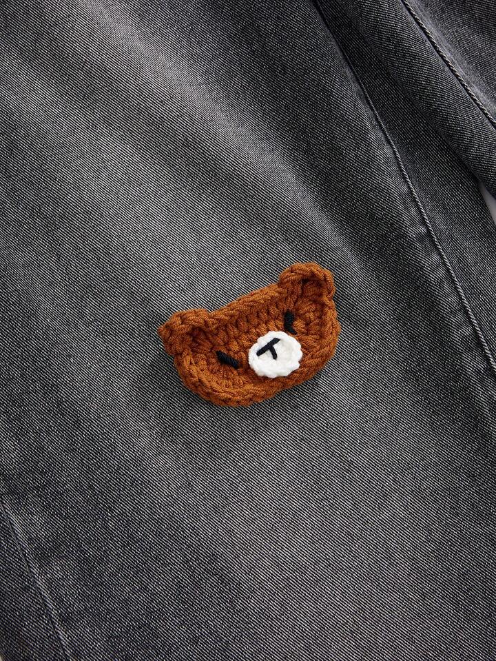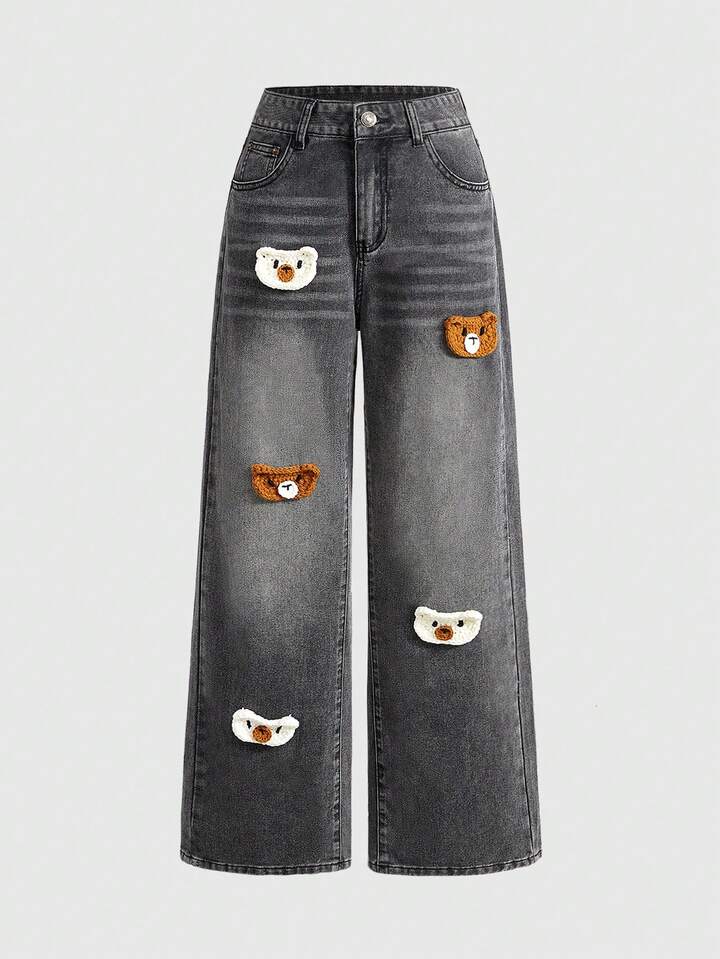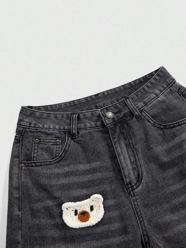 Kawaii Jeans a zampa d'elefante con dettagli a maglia a forma di orsetto carini per donna
