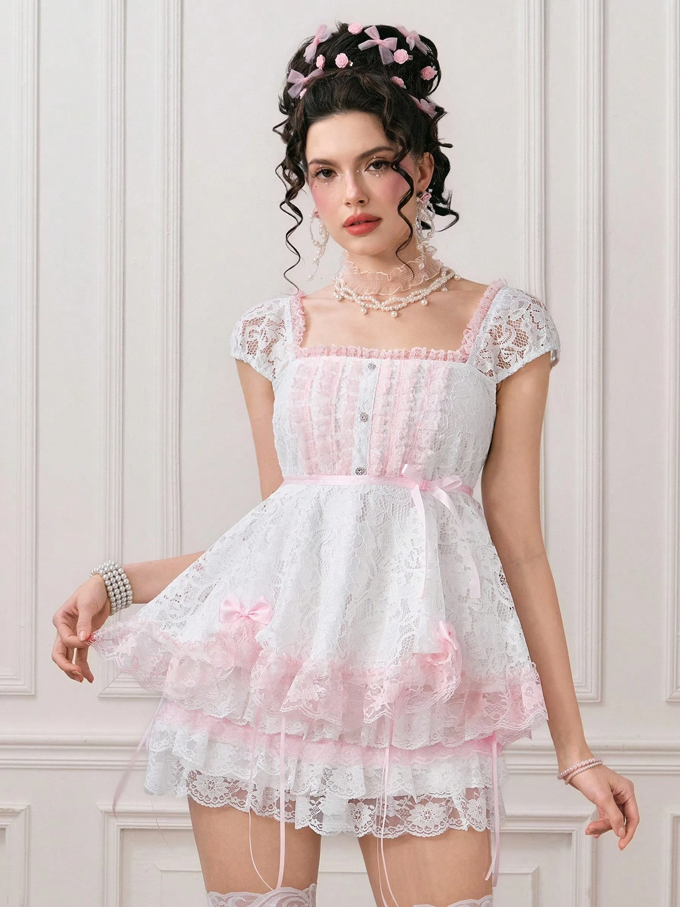 Kawaii Maglietta da donna con scollo dolce, decorata con fiocco e pizzo