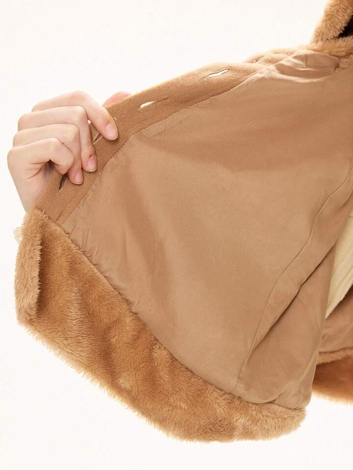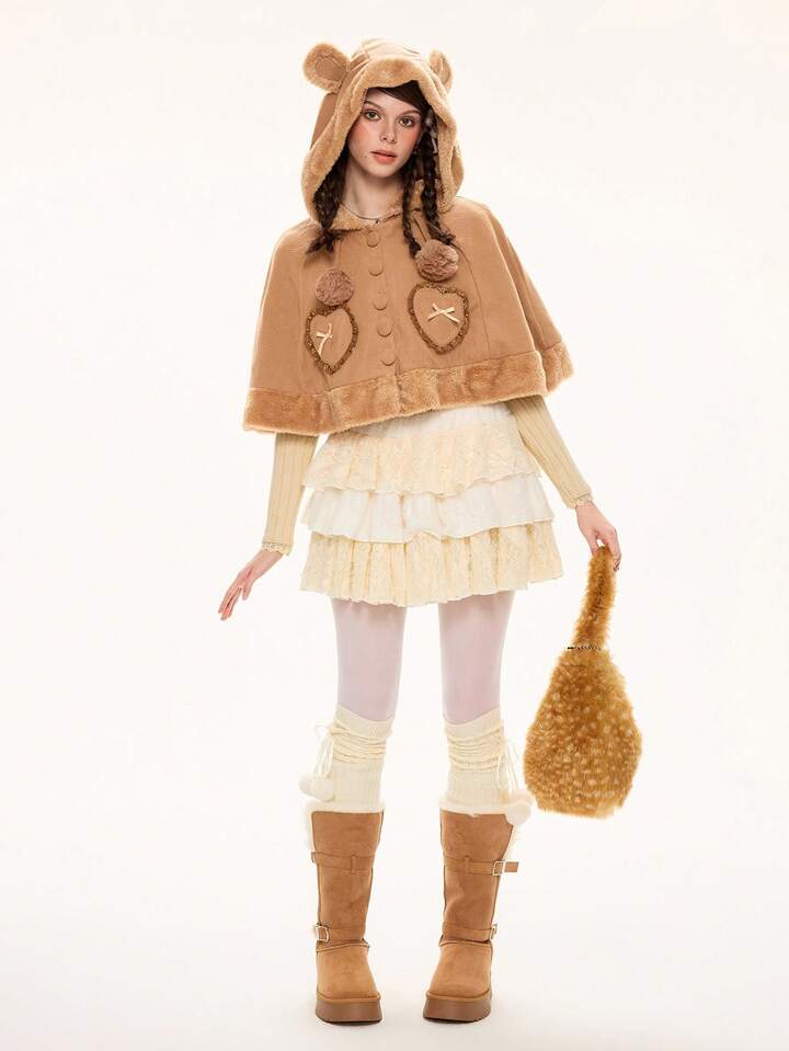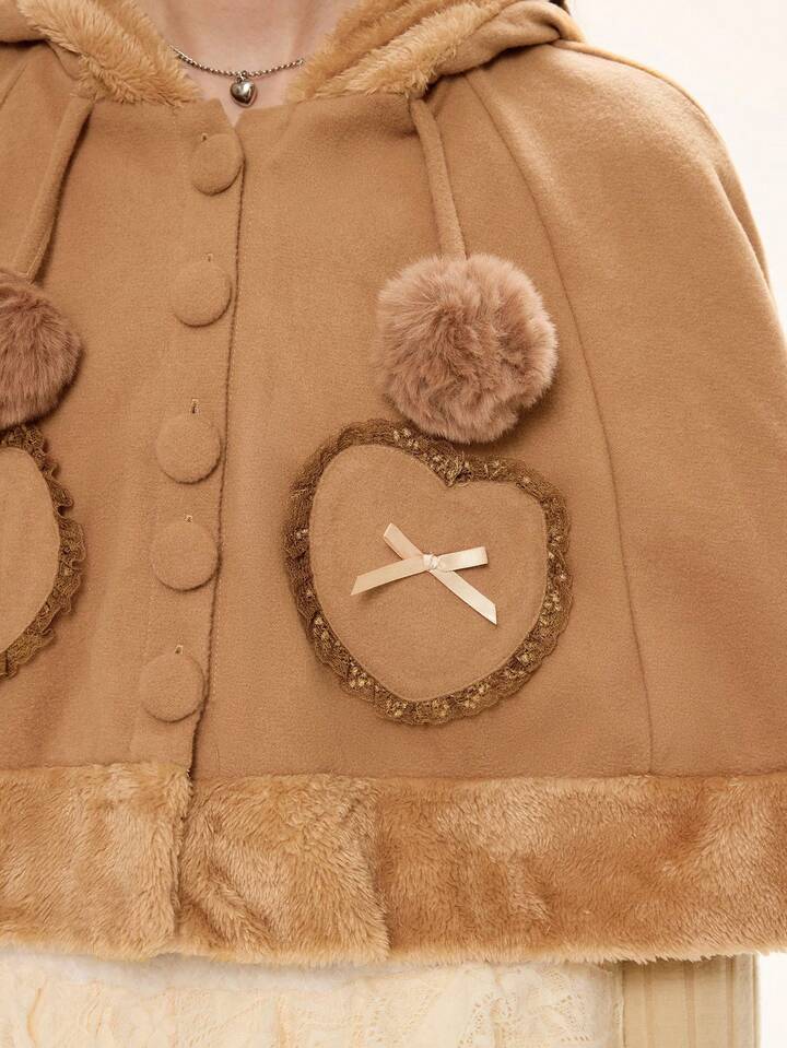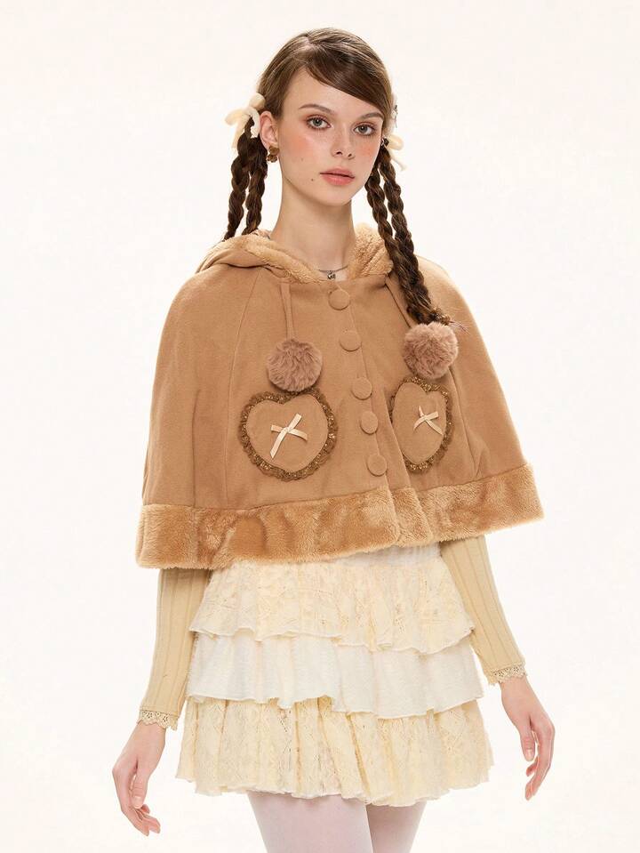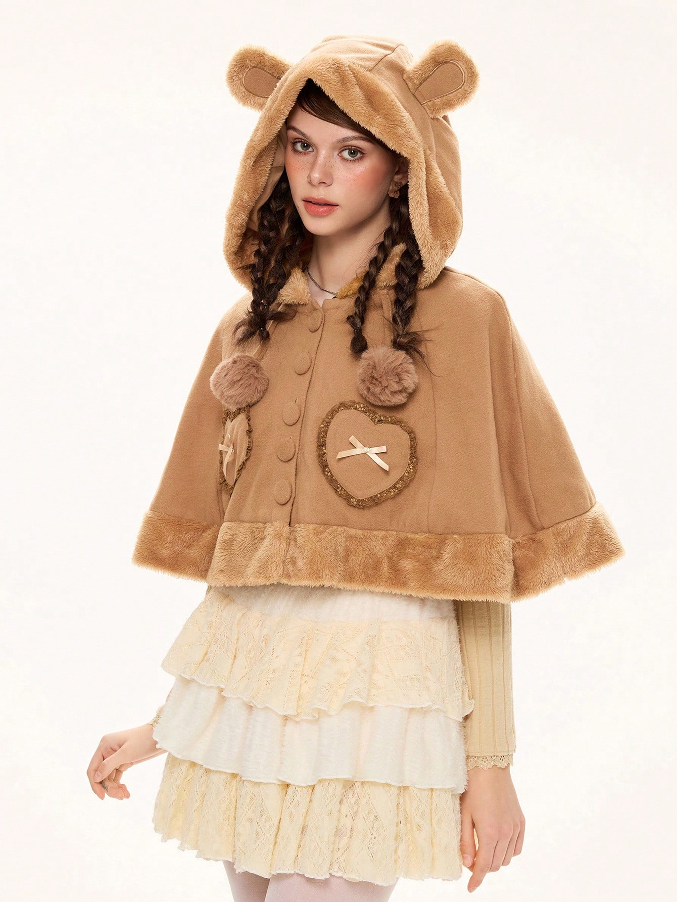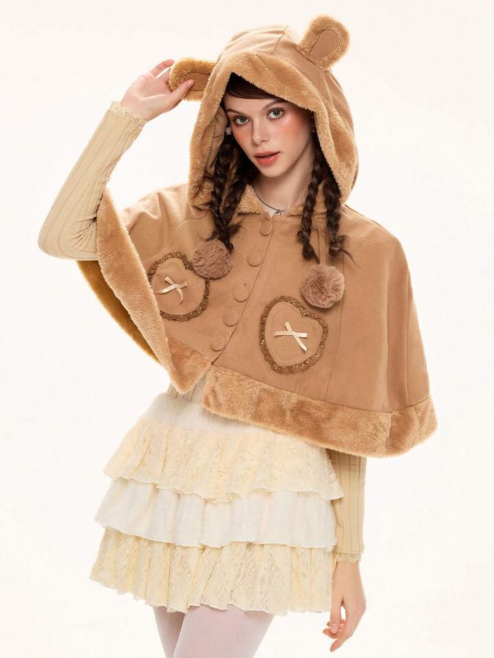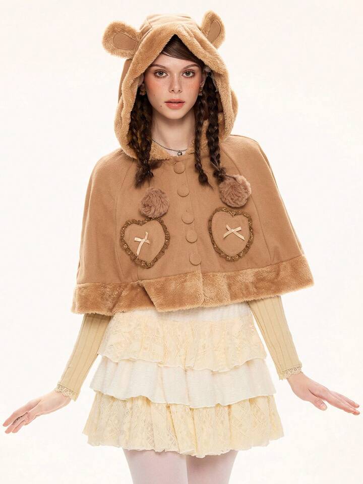 Kawaii Mantella con cappuccio in misto lana con applicazioni a tema orsetto teddy, colore marrone