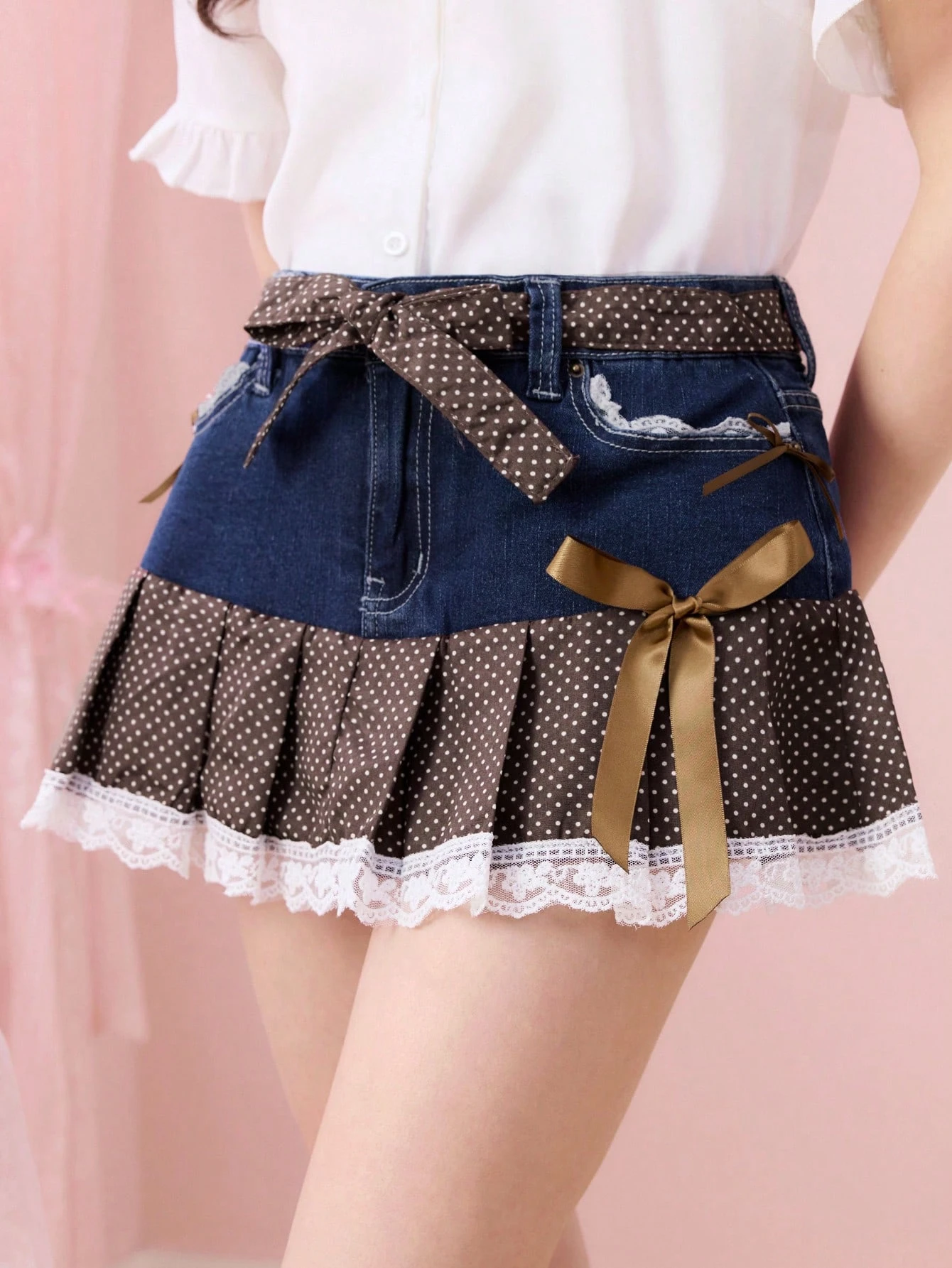 Kawaii Gonna mini di jeans plissettata con cintura, bordo in pizzo a contrasto e pois per donna