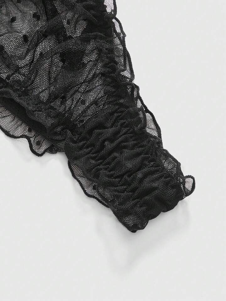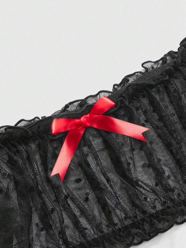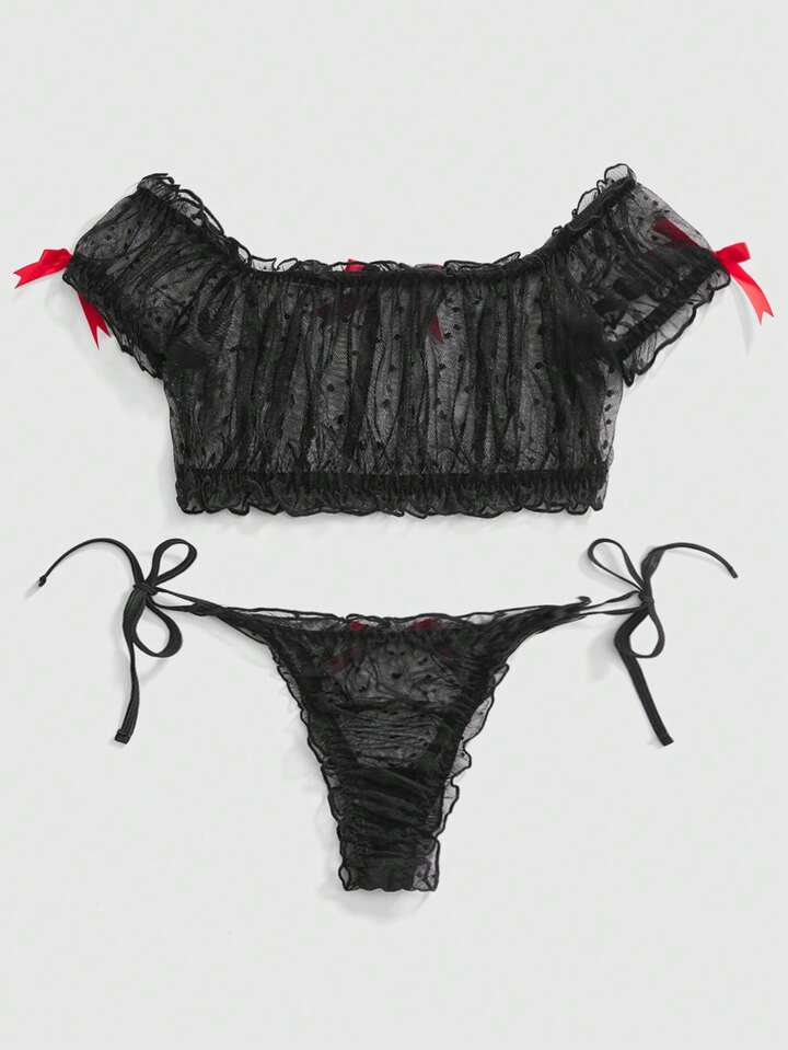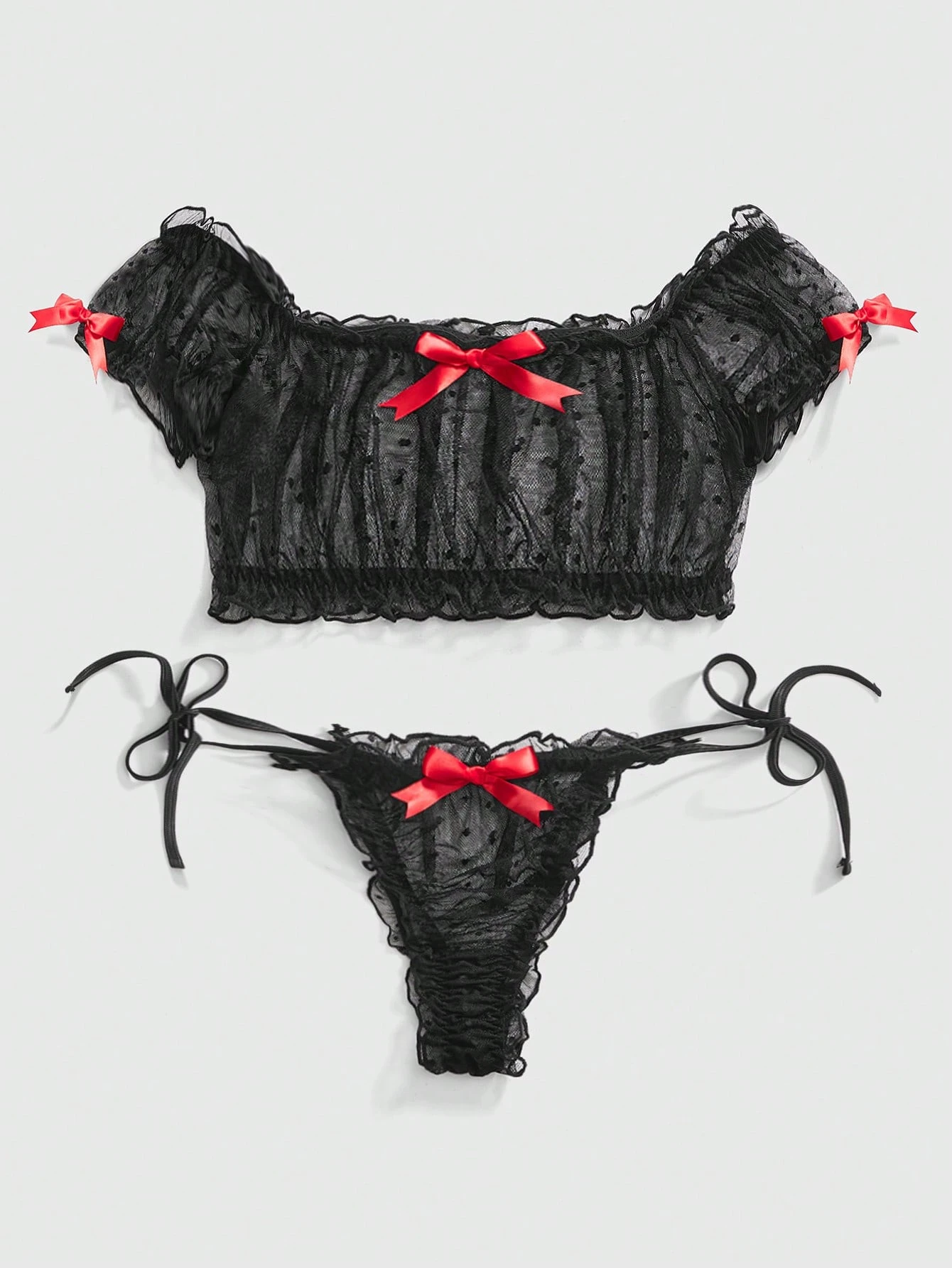 Kawaii Set di lingerie sexy da donna con spalle scoperte, arricciature e lacci a pois in rete
