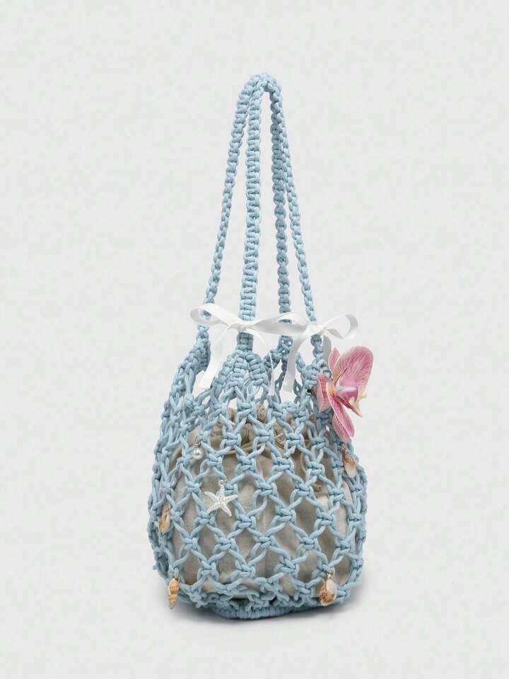Kawaii Borsa a tracolla da donna in stile retrò con fiocco ricamato e slogan in inglese, grande capacità adatta per lo shopping e la scuola