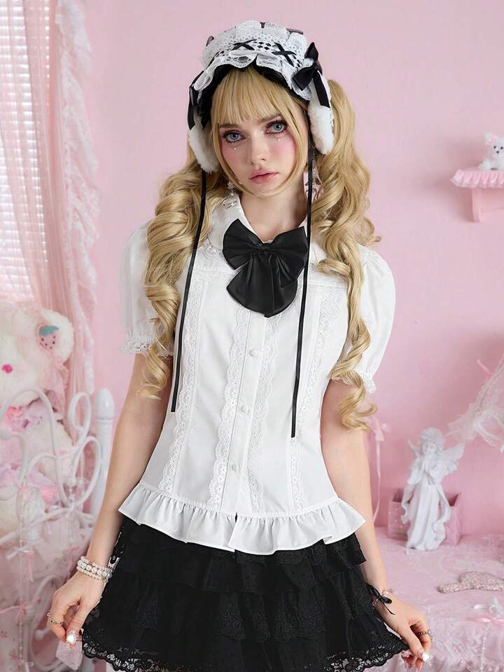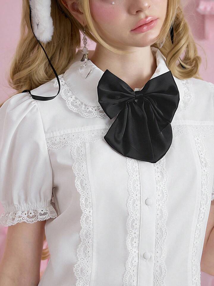 Kawaii Camicia vintage da donna in stile college, con fiocco a contrasto, patch in pizzo e maniche a palloncino