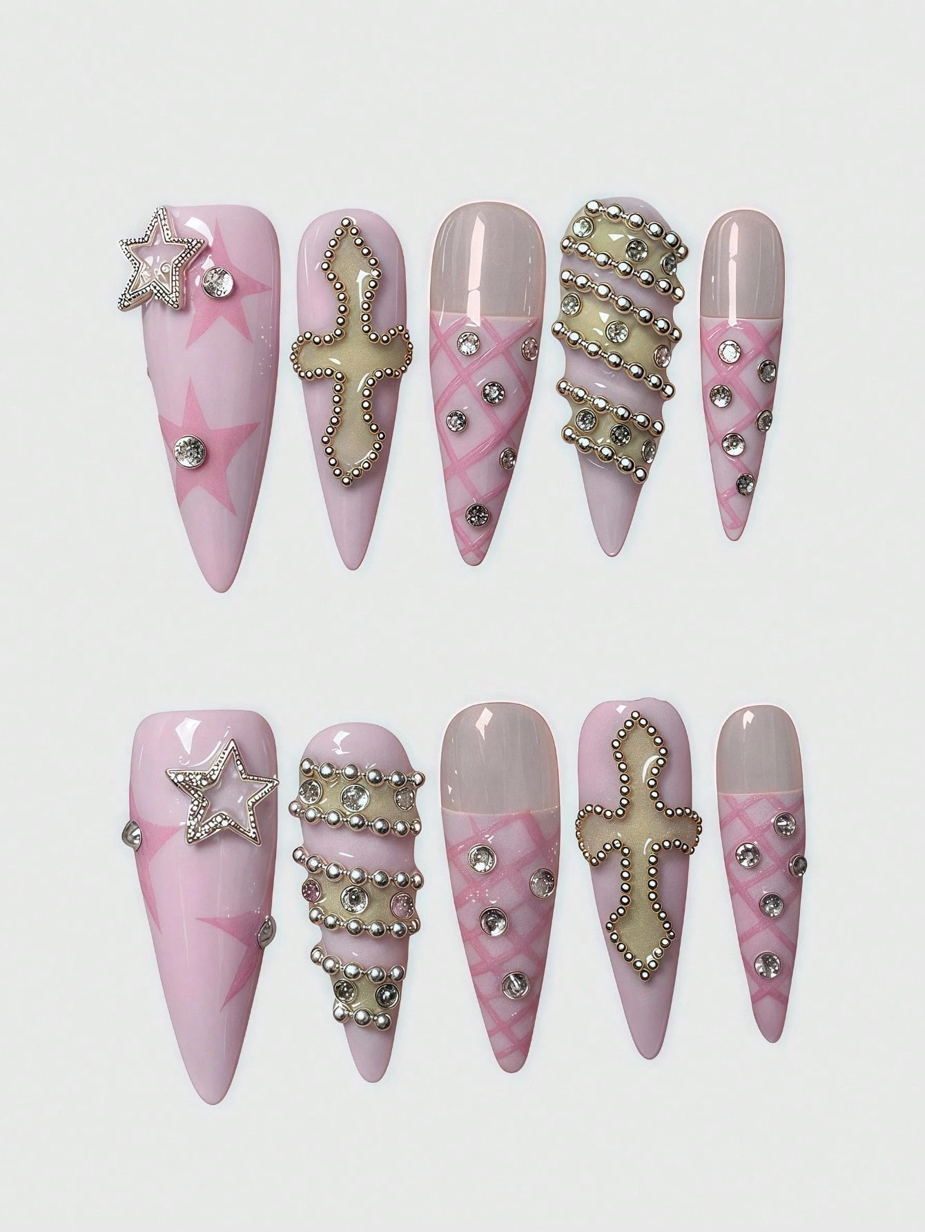 Kawaii Set di unghie finte fatti a mano stile Y2K punk, con design a stelle e croci rosa metallico a quadri, set estetico carino e audace da ragazza rosa