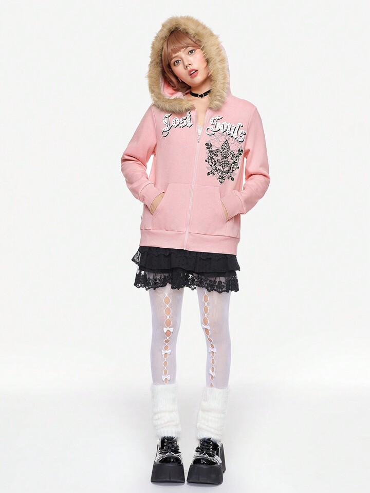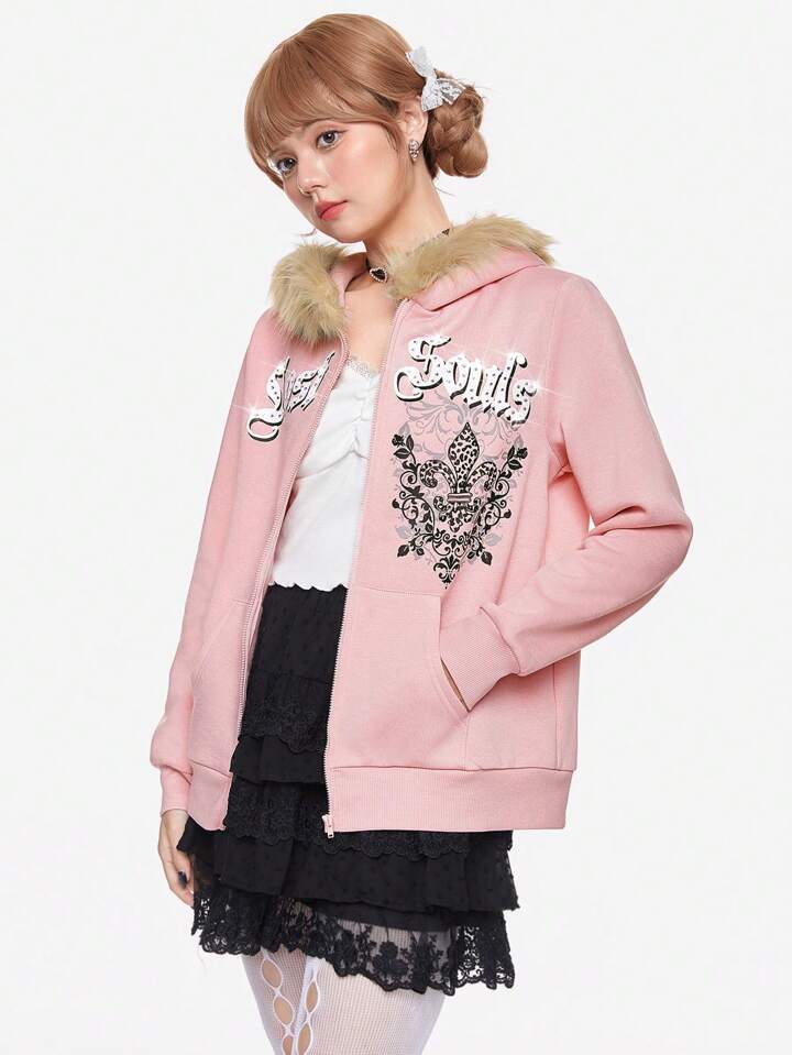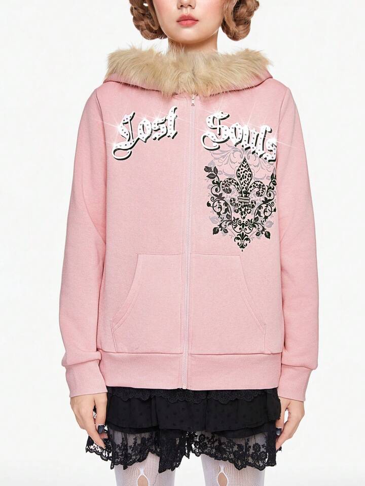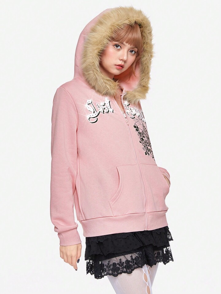 Kawaii Felpa con cappuccio vintage con bordi sfrangiati e decorata con strass, stile Y2K, per donna
