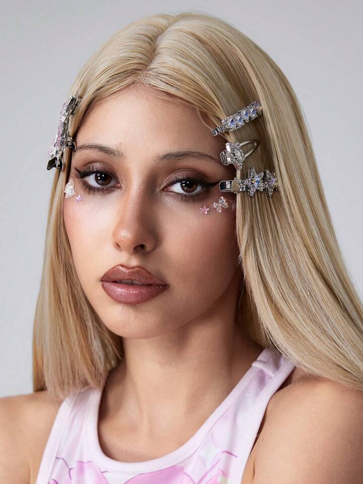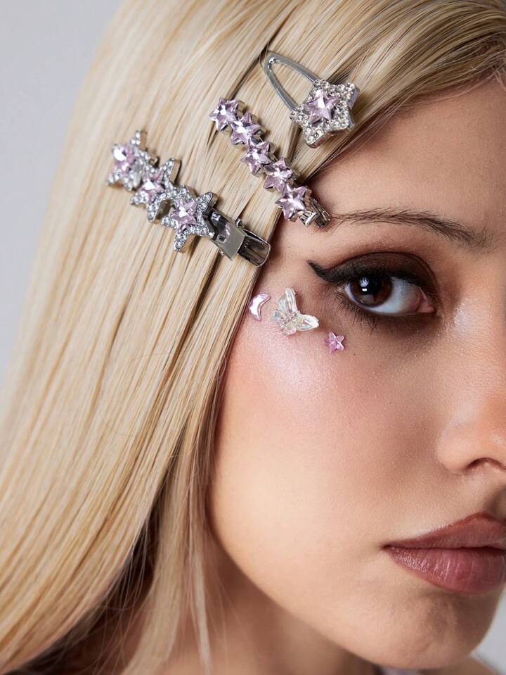 Kawaii Fermagli per capelli con stelle e lune in metallo e strass, set di accessori per capelli e gioielli per il viso in stile Y2K