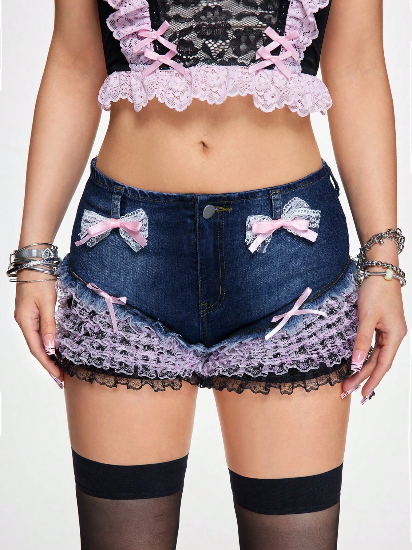 Kawaii Jeans da donna in stile di strada Y2K, sexy, con toppe in pizzo, 2 in 1