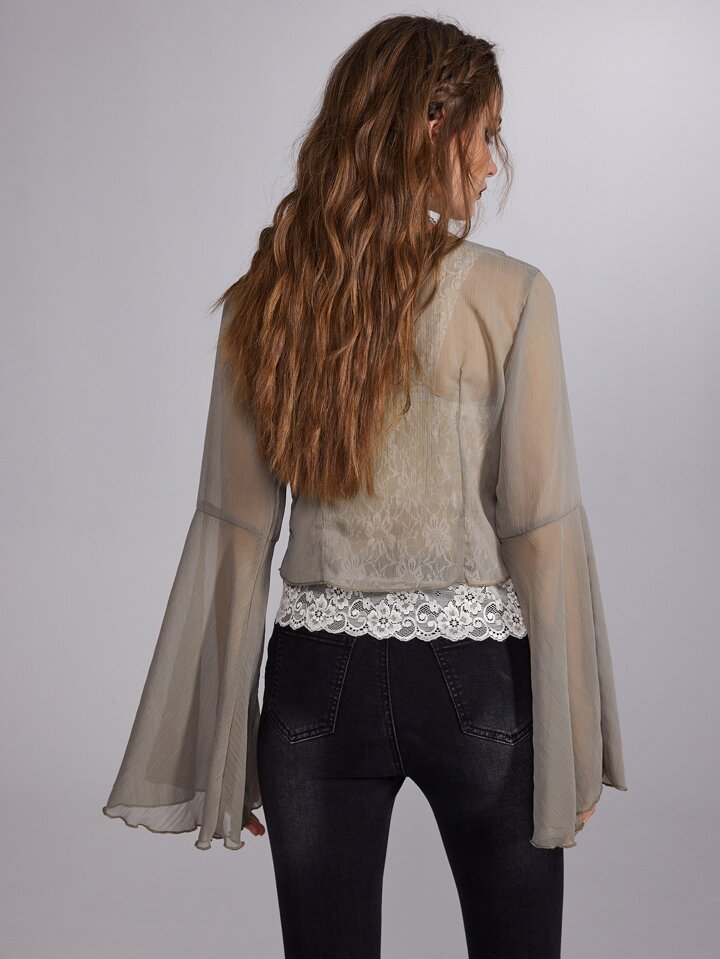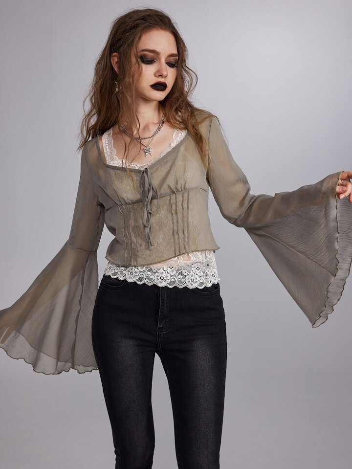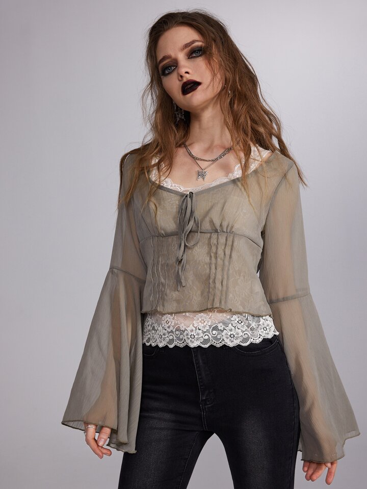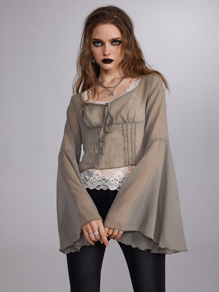 pizzo Top con bretelle sottile & mesh manica svasata Top corto
