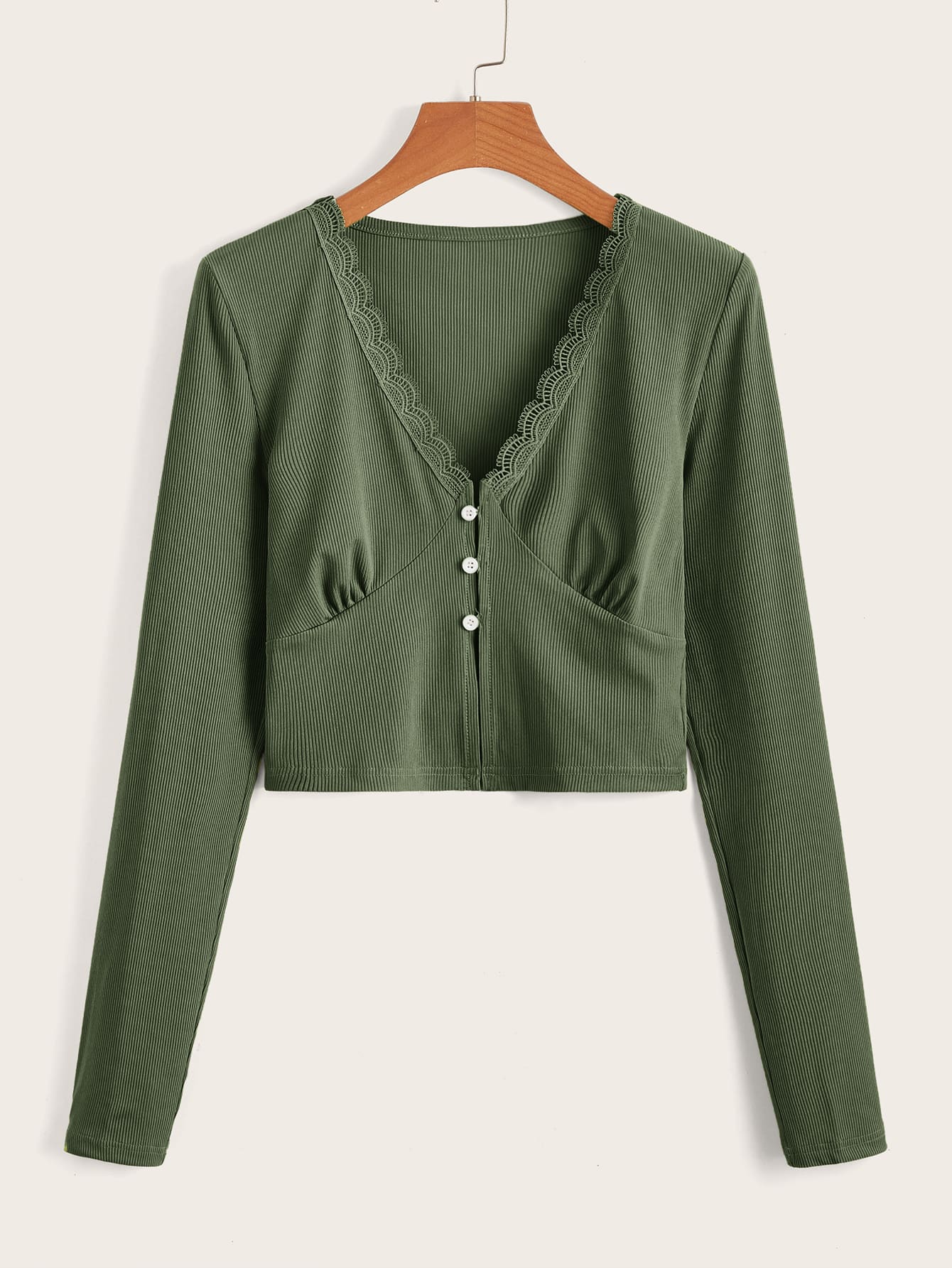 Maglietta corta orlo di pizzo con bottone frontale a costine