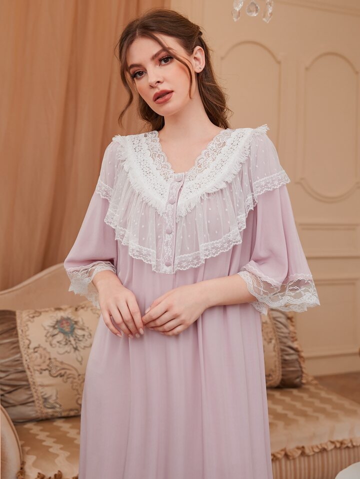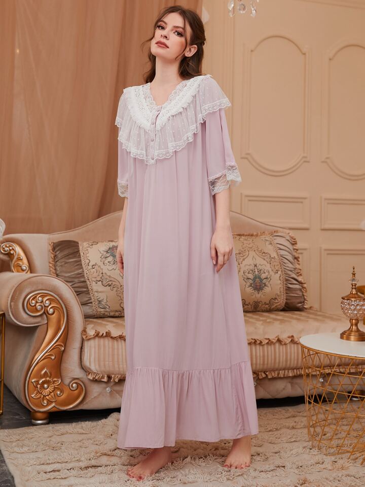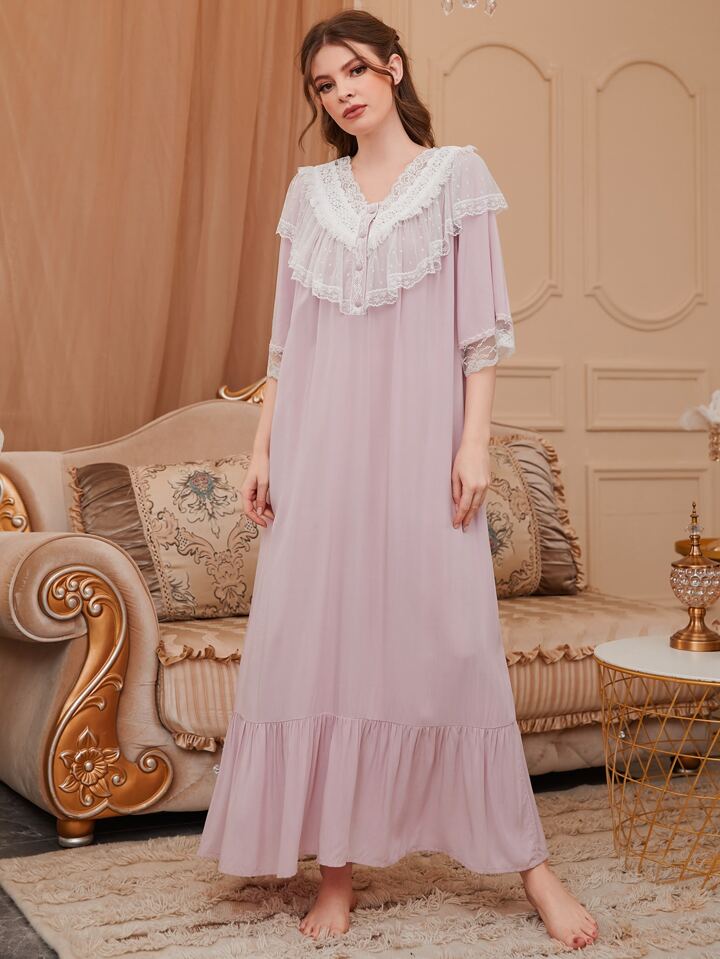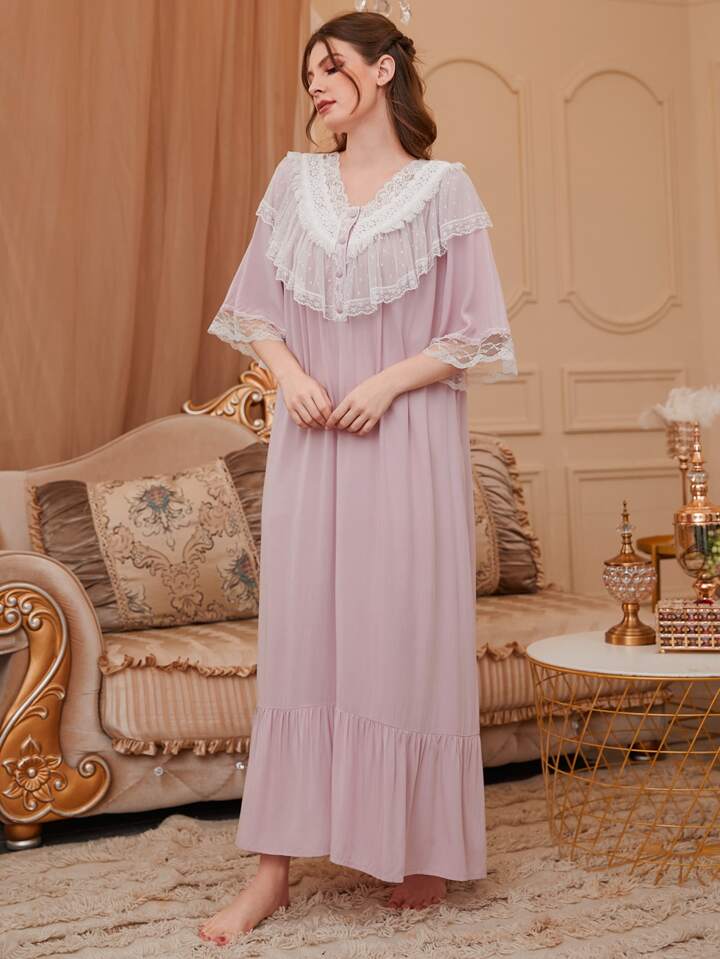 Abito da notte con volant, bottoni e bordo in pizzo, vestito lungo da camera da letto di lusso, Moo Moo