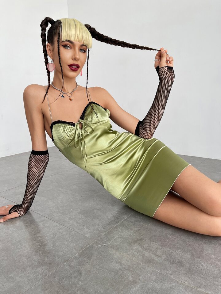Abito aderente orlo di pizzo busto plissettato nodo frontale raso