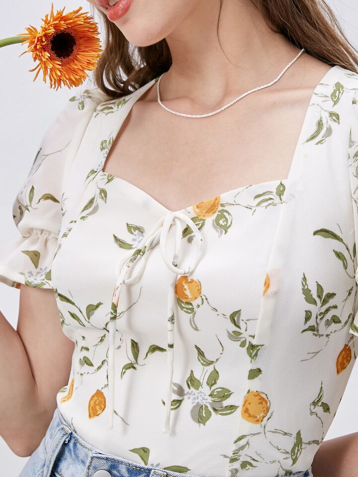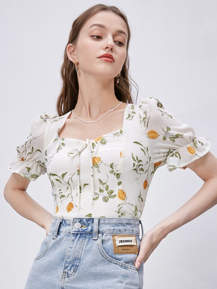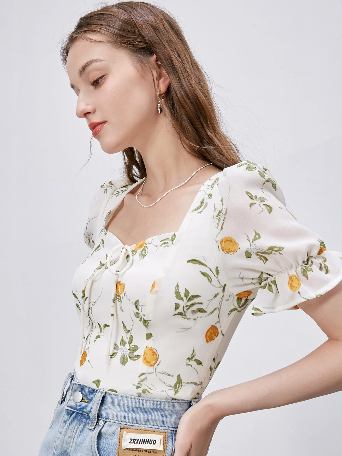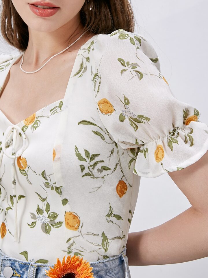 Camicetta con stampa limone collo a cuore nodo frontale con manica a sbuffo indietro arricciato