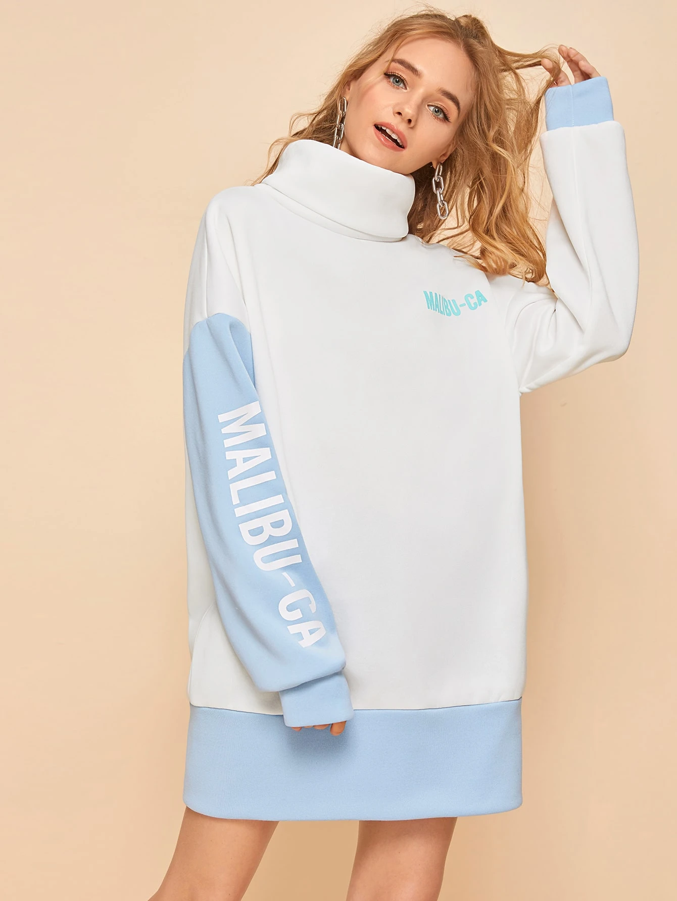 Abito felpa di blocchi di colore con collo alto e lettera grafica