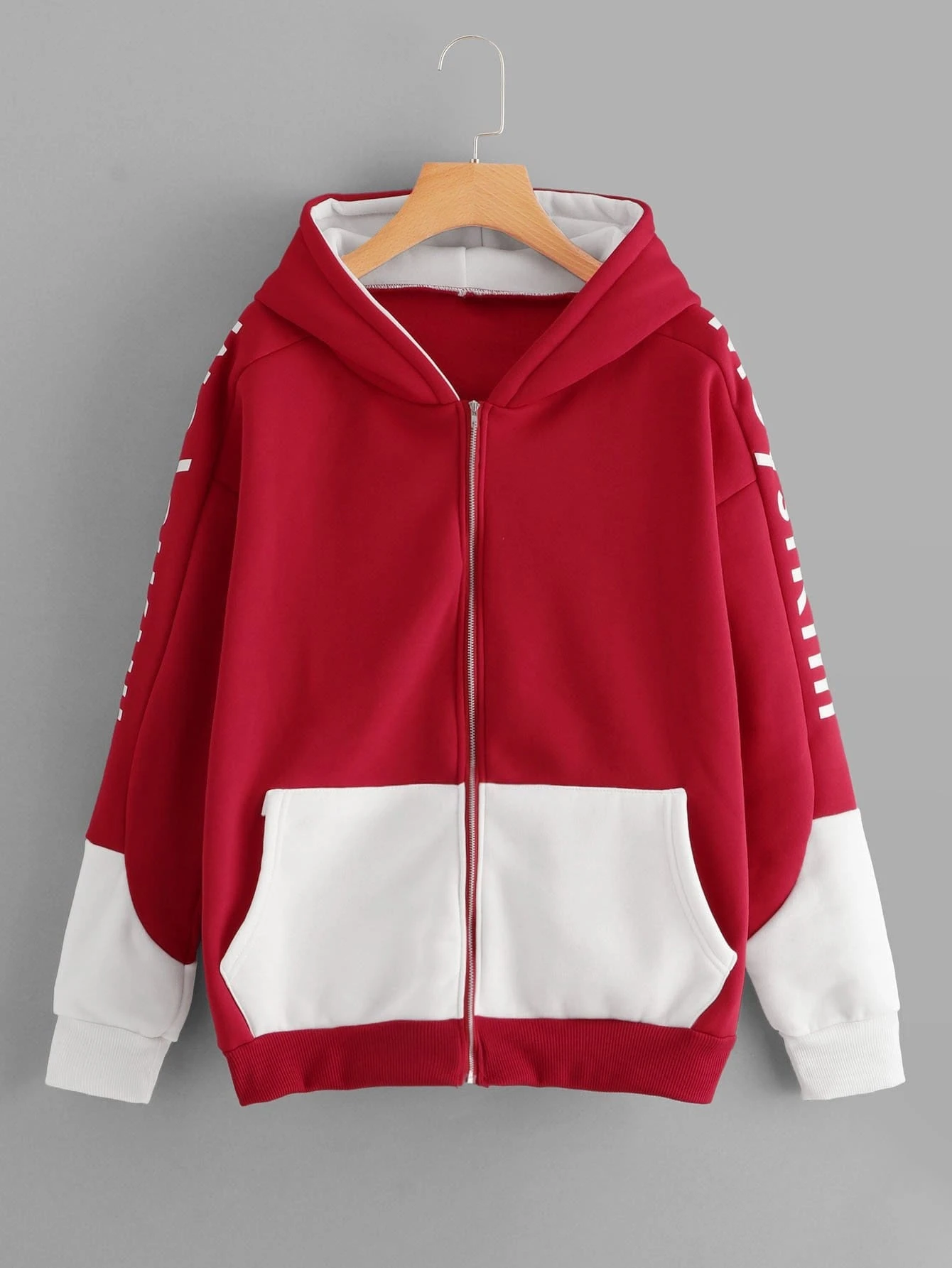 Felpa con cappuccio a blocco di colore con zip e manica con stampa di lettera