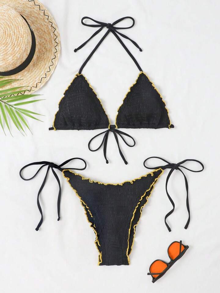 Bikini estivo con laccetti, reggiseno a triangolo con collo ad anello e volant di lattuga, mutandine con laccetti laterali
