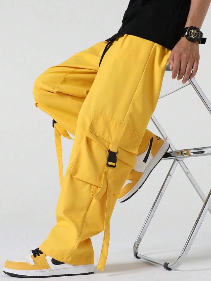 Manfinity EZcore Pantaloni cargo oversize da uomo con tasche con patta, vita con coulisse, pantaloni larghi e semplici per uscire, pantaloni gialli da uomo, pantaloni cargo da uomo, pantaloni paracadute, per l'autunno