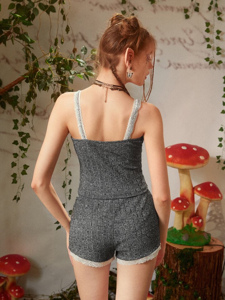 Set Lounge in maglia variegata pizzo a contrasto con bottone frontale