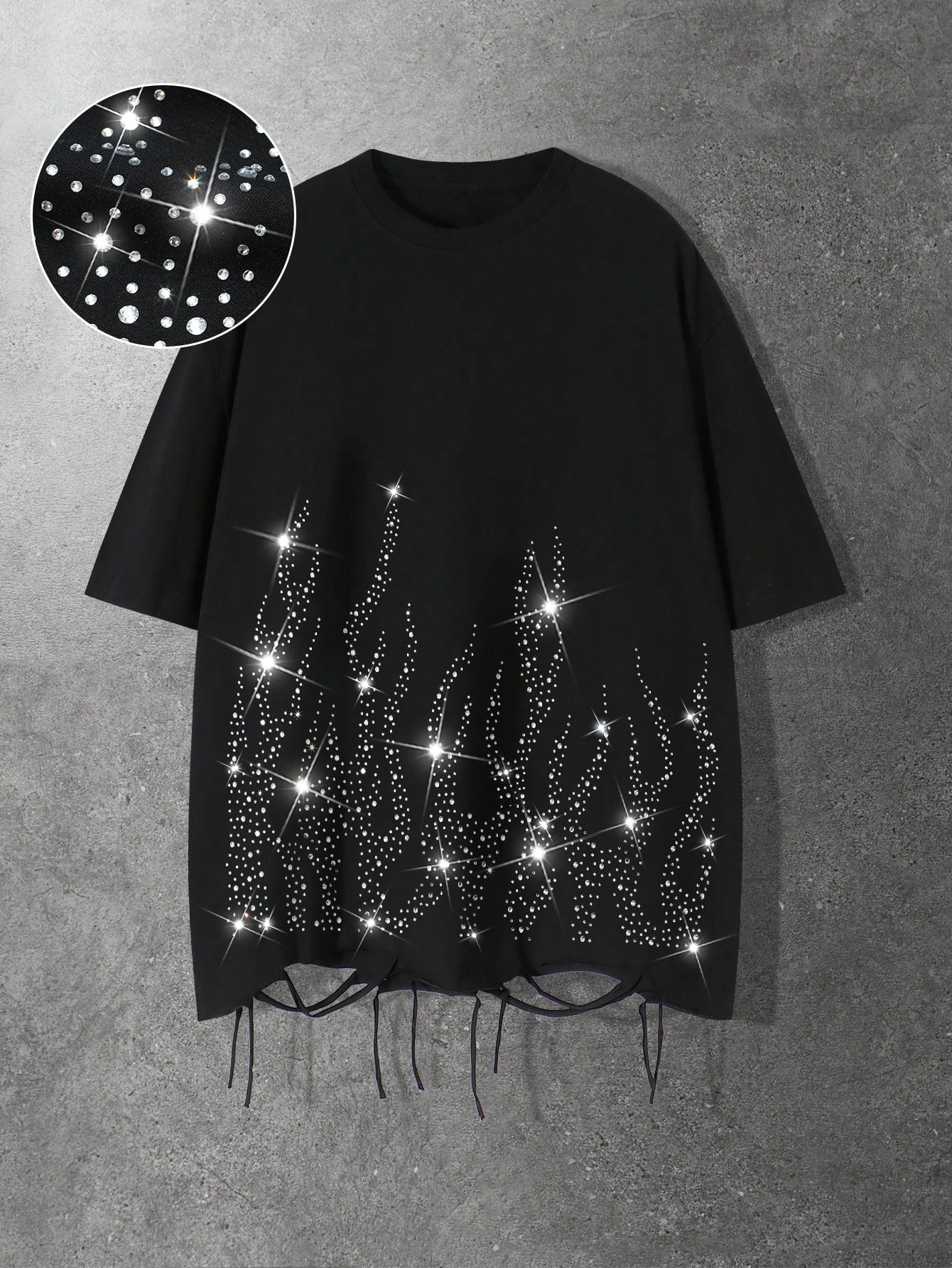 maglietta casual da uomo con vestibilità ampia, nera, con motivo a fiamma in strass, adatta per l'uso quotidiano e lo stile di strada, per l'estate