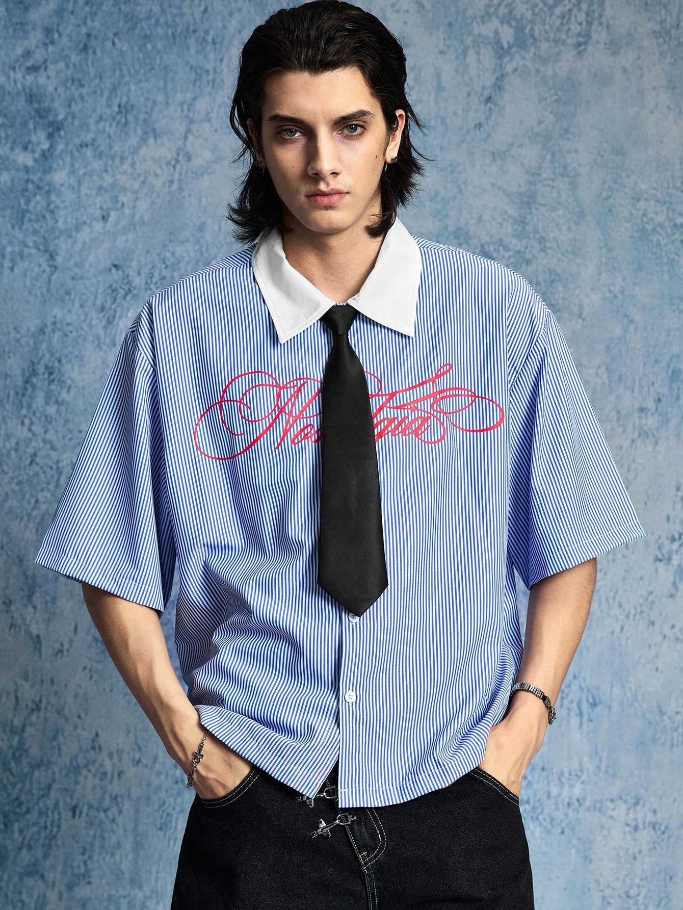 Camicia casual da uomo a maniche corte con stampa a righe e lettere, bottoni davanti, estiva