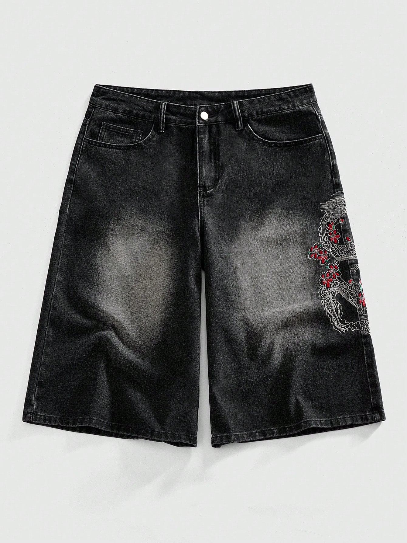 Jeans casual larghi a 3/4 da uomo con motivo del drago cinese sulla tasca