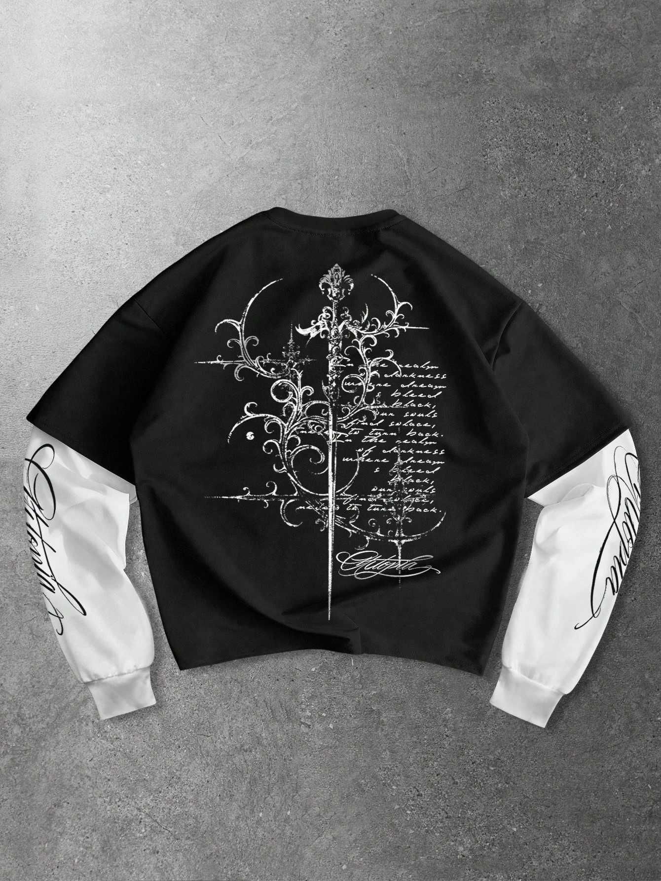 Maglietta a maniche lunghe da uomo con stampa a patchwork di croci scure e scritta in inglese, per uso quotidiano