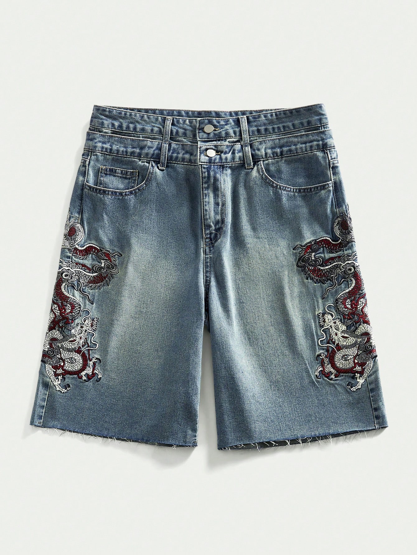 Pantaloncini di jeans larghi da uomo con ricamo a drago