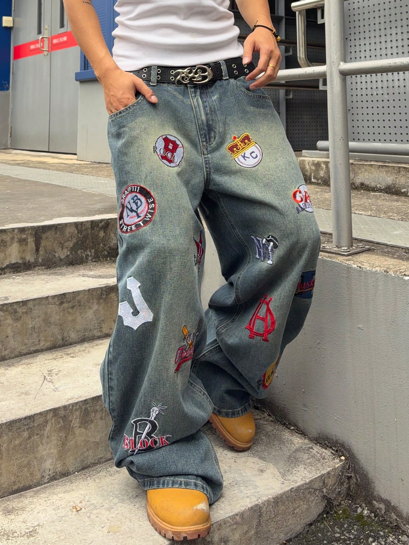 Jeans in denim lavato ampio con motivo ricamato da uomo