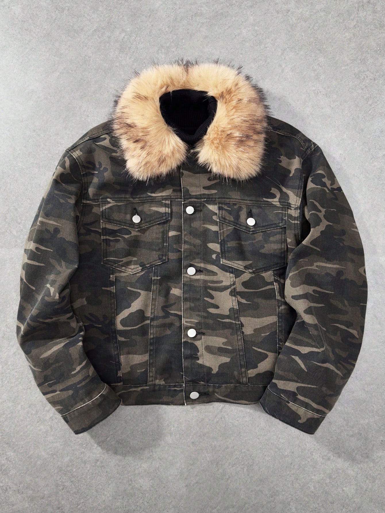 Giacca di jeans casual monopetto con colletto in pelliccia e motivo mimetico, manica lunga, da uomo