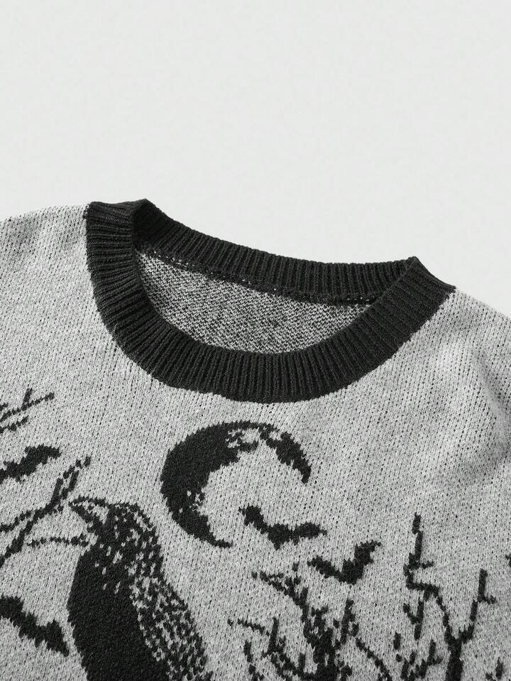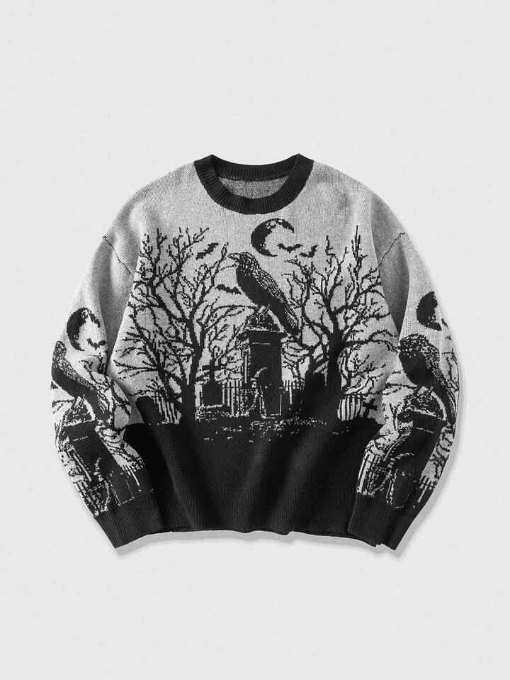 Goth Maglione casual con vestibilità ampia, lavorazione jacquard con motivi di edifici e piante, adatto per autunno/inverno