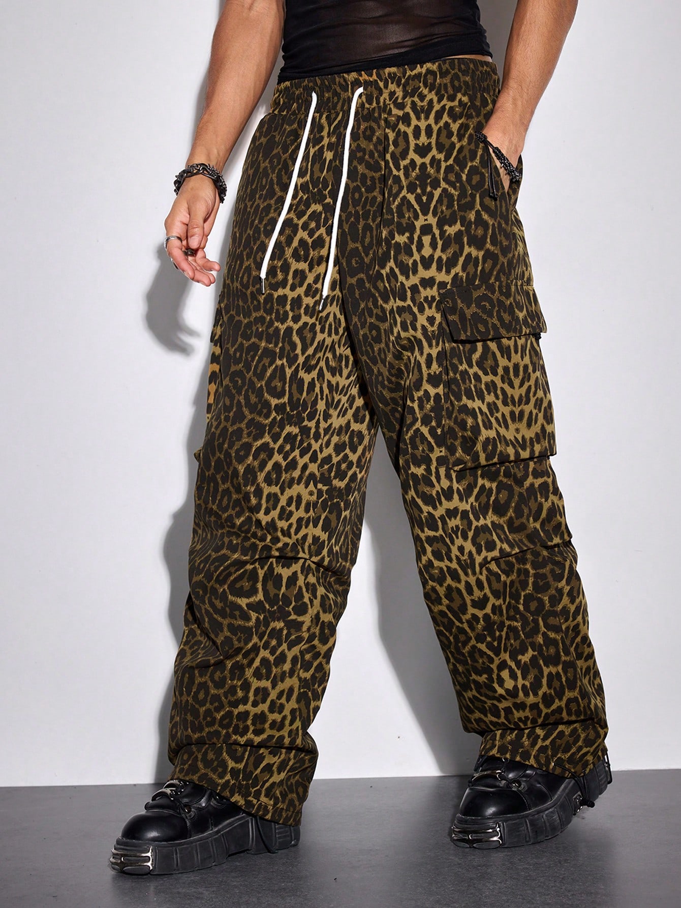 Pantaloni cargo casual da uomo con stampa leopardata e vita con laccio