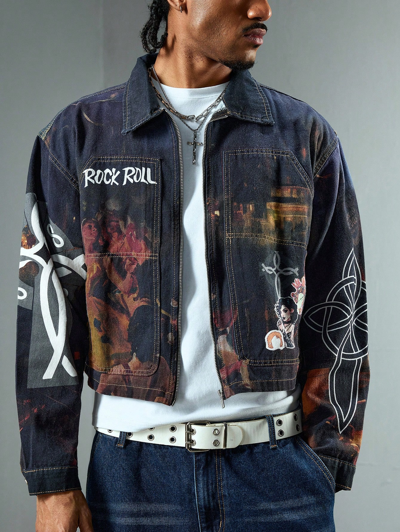 Giacca di jeans da uomo con chiusura lampo e stampa di lettere sulle maniche lunghe